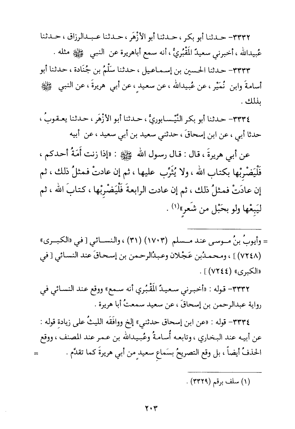 3334 - نا أَبُو بَكْرٍ النَّيْسَابُورِيُّ , نا أَبُو الْأَزْهَرِ , نا يَعْقُوبُ , نا أَبِي , عَنِ ابْنِ إِسْحَاقَ , حَدَّثَنِي سَعِيدُ بْنُ أَبِي سَعِيدٍ , عَنْ أَبِيهِ , عَنْ أَبِي هُرَيْرَةَ , قَالَ: قَالَ رَسُولُ اللَّهِ صَلَّى اللهُ عَلَيْهِ وَسَلَّمَ: § «إِذَا زَنَتْ أَمَةُ أَحَدِكُمْ فَلْيَضْرِبْهَا بِكِتَابِ اللَّهِ لَا يُثَرِّبْ عَلَيْهَا , ثُمَّ إِنْ عَادَتْ فَمِثْلَ ذَلِكَ , ثُمَّ إِنْ عَادَتْ فَمِثْلَ ذَلِكَ , ثُمَّ إِنْ عَادَتْ فَمِثْلَ ذَلِكَ , ثُمَّ إِنْ عَادَتِ الرَّابِعَةَ فَلْيَضْرِبْهَا بِكِتَابِ اللَّهِ ثُمَّ لِيَبِعْهَا وَلَوْ بِحَبْلٍ مِنْ شَعَرٍ» -[205]-