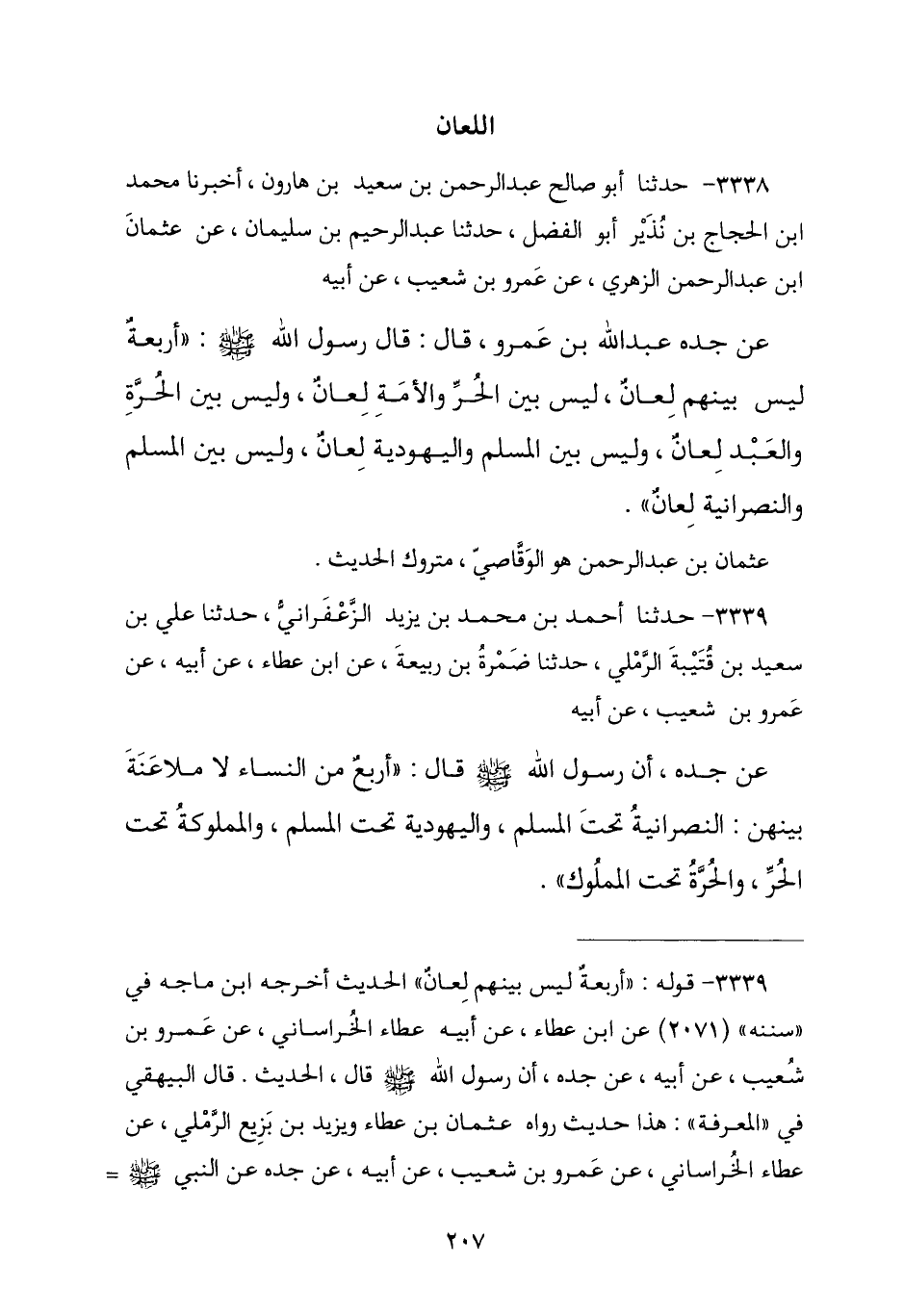3338 - نا أَبُو صَالِحٍ عَبْدُ الرَّحْمَنِ بْنُ سَعِيدِ بْنِ هَارُونَ , أنا مُحَمَّدُ بْنُ الْحَجَّاجِ بْنِ نَذِيرٍ أَبُو الْفَضْلِ , نا عَبْدُ الرَّحِيمِ بْنُ سُلَيْمَانَ , عَنْ عُثْمَانَ بْنِ عَبْدِ الرَّحْمَنِ الزُّهْرِيِّ , عَنْ عَمْرِو بْنِ شُعَيْبٍ , عَنْ أَبِيهِ , عَنْ جَدِّهِ عَبْدِ اللَّهِ بْنِ عَمْرٍو , قَالَ: قَالَ رَسُولُ اللَّهِ صَلَّى اللهُ عَلَيْهِ وَسَلَّمَ: § «أَرْبَعَةٌ لَيْسَ بَيْنَهُمْ لِعَانٌ , لَيْسَ بَيْنَ الْحُرِّ وَالْأَمَةِ لِعَانٌ , وَلَيْسَ بَيْنَ الْحُرَّةِ وَالْعَبْدِ لِعَانٌ , وَلَيْسَ بَيْنَ الْمُسْلِمِ وَالْيَهُودِيَّةِ لِعَانٌ , وَلَيْسَ بَيْنَ الْمُسْلِمِ وَالنَّصْرَانِيَّةِ لِعَانٌ». عُثْمَانُ بْنُ عَبْدِ الرَّحْمَنِ هُوَ الْوَقَّاصِيُّ مَتْرُوكُ الْحَدِيثِ