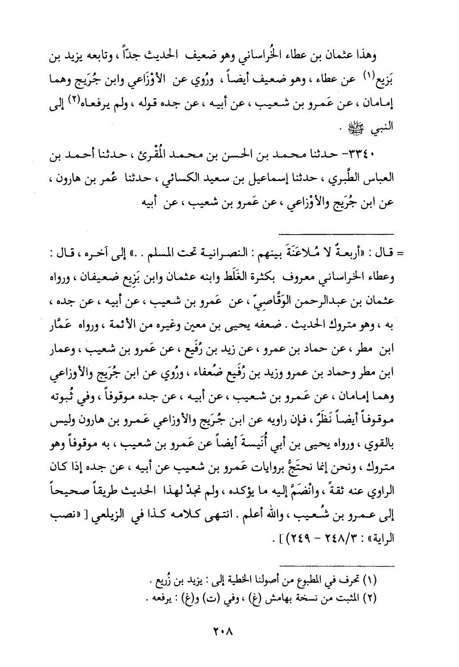 3341 - نا الرَّهَاوِيُّ الْحَسَنُ بْنُ أَحْمَدَ بْنِ سَعِيدٍ , نا مُحَمَّدُ بْنُ أَبِي فَرْوَةَ , نا أَبِي , نا عَمَّارُ بْنُ مَطَرٍ , نا حَمَّادُ بْنُ عَمْرٍو , عَنْ زَيْدِ بْنِ رُفَيْعٍ , عَنْ عَمْرِو بْنِ شُعَيْبٍ , عَنْ أَبِيهِ , عَنْ جَدِّهِ , أَنَّ رَسُولَ اللَّهِ صَلَّى اللهُ عَلَيْهِ وَسَلَّمَ بَعَثَ عَتَّابَ بْنَ أَسَدٍ ثُمَّ ذَكَرَ نَحْوَهُ. حَمَّادُ بْنُ عَمْرٍو , وَعَمَّارُ بْنُ مَطَرٍ , وَزَيْدُ بْنُ رُفَيْعٍ ضُعَفَاءُ
