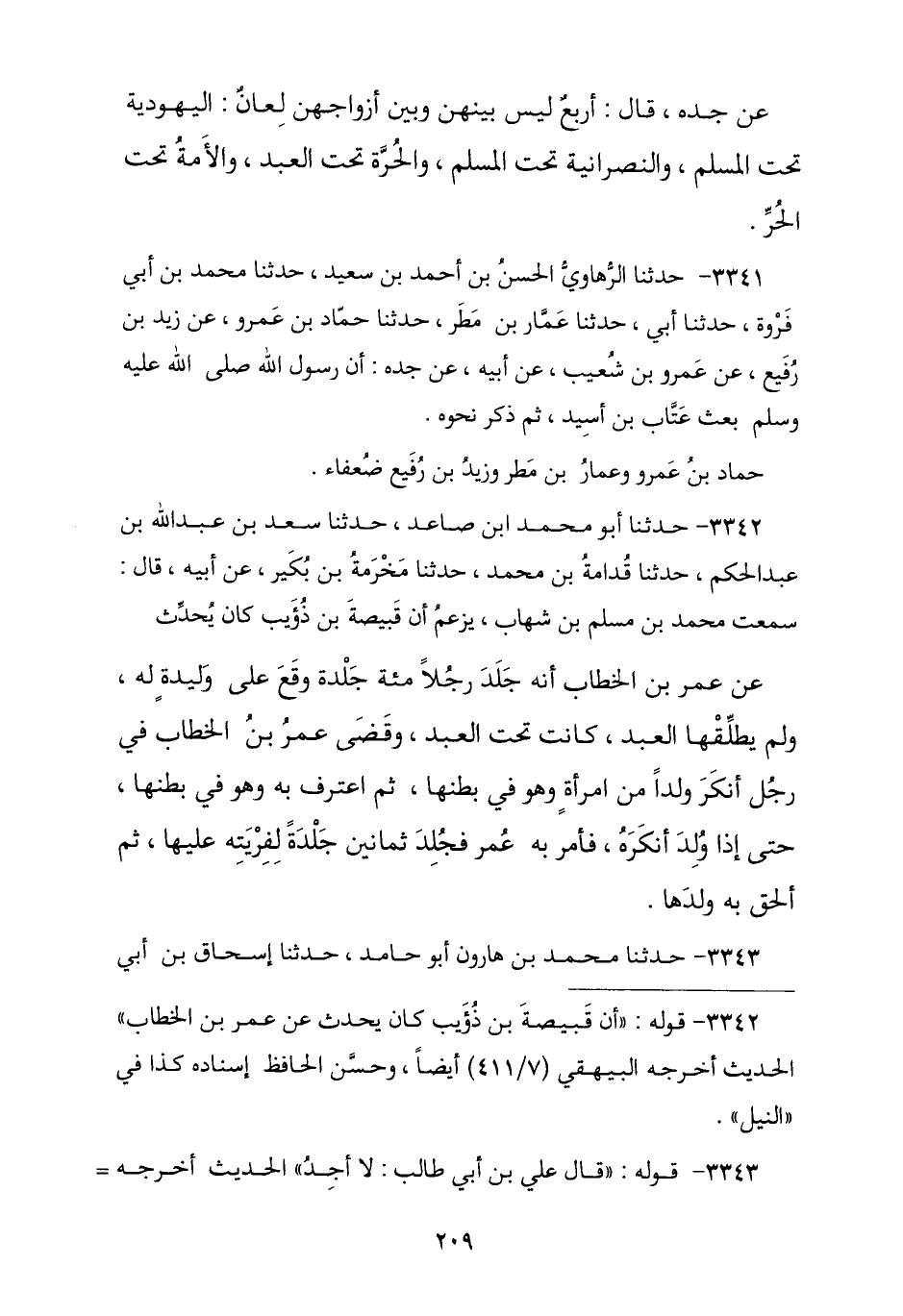 3342 - نا أَبُو مُحَمَّدِ بْنُ صَاعِدٍ , نا سَعْدُ بْنُ عَبْدِ اللَّهِ بْنِ عَبْدِ الْحَكَمِ , نا قُدَامَةُ بْنُ مُحَمَّدٍ , نا مَخْرَمَةُ بْنُ بُكَيْرٍ , عَنْ أَبِيهِ , قَالَ سَمِعْتُ مُحَمَّدَ بْنَ مُسْلِمِ بْنِ شِهَابٍ , يَزْعُمُ أَنَّ قَبِيصَةَ بْنَ ذُؤَيْبٍ , كَانَ يُحَدِّثُ عَنْ عُمَرَ بْنِ الْخَطَّابِ , أَنَّهُ §جَلَدَ رَجُلًا مِائَةَ جَلْدَةٍ وَقَعَ عَلَى وَلِيدَةٍ لَهُ , وَلَمْ يُطَلِّقْهَا الْعَبْدُ , كَانَتْ تَحْتَ الْعَبْدِ , «وَقَضَى عُمَرُ بْنُ الْخَطَّابِ رَضِيَ اللَّهُ عَنْهُ فِي رَجُلٍ أَنْكَرَ وَلَدًا مِنَ امْرَأَةٍ وَهُوَ فِي بَطْنِهَا , ثُمَّ اعْتَرَفَ بِهِ وَهُوَ فِي بَطْنِهَا , حَتَّى إِذَا وُلِدَ أَنْكَرَهُ , فَأَمَرَ بِهِ عُمَرُ فَجُلِدَ ثَمَانِينَ جَلْدَةً لِفِرْيَتِهِ عَلَيْهَا , ثُمَّ أَلْحَقَ بِهِ وَلَدَهَا»