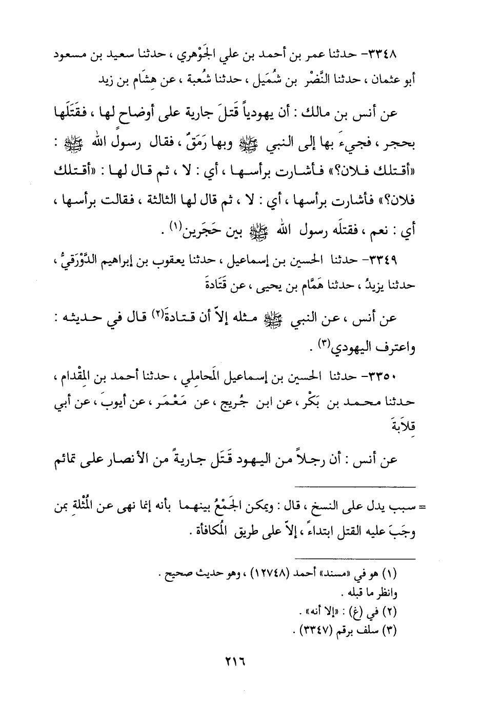 3348 - نا عُمَرُ بْنُ أَحْمَدَ بْنِ عَلِيٍّ الْجَوْهَرِيُّ , نا سَعِيدُ بْنُ مَسْعُودٍ أَبُو عُثْمَانَ , نا النَّضْرُ بْنُ شُمَيْلٍ , نا شُعْبَةُ , عَنْ هِشَامِ بْنِ زَيْدٍ , عَنْ أَنَسِ بْنِ مَالِكٍ , أَنَّ يَهُودِيًّا قَتَلَ جَارِيَةً عَلَى أَوْضَاحٍ لَهَا , فَقَتَلَهَا بِحَجَرٍ فَجِيءَ بِهَا إِلَى النَّبِيِّ صَلَّى اللهُ عَلَيْهِ وَسَلَّمَ وَبِهَا رَمَقٌ , فَقَالَ رَسُولُ اللَّهِ صَلَّى اللهُ عَلَيْهِ وَسَلَّمَ: «أَقَتَلَكِ فُلَانٌ؟» فَأَشَارَتْ بِرَأْسِهَا , أَيْ: لَا , ثُمَّ قَالَ لَهَا: «أَقَتَلَكِ فُلَانٌ؟» , فَأَشَارَتْ بِرَأْسِهَا أَيْ: لَا , ثُمَّ قَالَ لَهَا الثَّالِثَةَ فَقَالَتْ بِرَأْسِهَا أَيْ: نَعَمْ , §فَقَتَلَهُ رَسُولُ اللَّهِ صَلَّى اللهُ عَلَيْهِ وَسَلَّمَ بَيْنَ حَجَرَيْنِ.