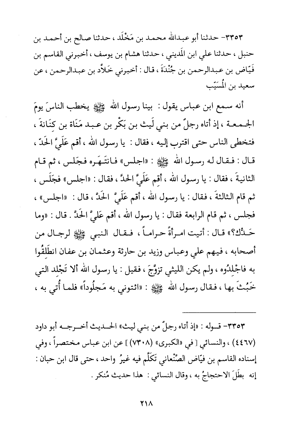 3353 - نا أَبُو عَبْدِ اللَّهِ مُحَمَّدُ بْنُ مَخْلَدٍ , نا صَالِحُ بْنُ أَحْمَدَ بْنِ حَنْبَلٍ , نا عَلِيُّ بْنُ الْمَدِينِيِّ , نا هِشَامُ بْنُ يُوسُفَ , أَخْبَرَنِي الْقَاسِمُ بْنُ فَيَّاضِ بْنِ عَبْدِ الرَّحْمَنِ بْنِ حَيْدَةَ , حَدَّثَنِي خَلَّادُ بْنُ عَبْدِ الرَّحْمَنِ , عَنْ سَعِيدِ بْنِ الْمُسَيِّبِ , أَنَّهُ سَمِعَ ابْنَ عَبَّاسٍ , يَقُولُ: بَيْنَا رَسُولُ اللَّهِ صَلَّى اللهُ عَلَيْهِ وَسَلَّمَ يَخْطُبُ النَّاسَ يَوْمَ الْجُمُعَةِ إِذْ أَتَاهُ رَجُلٌ مِنْ بَنِي لَيْثِ بْنِ بَكْرِ بْنِ عَبْدِ مَنَاةَ بْنِ كِنَانَةَ , فَتَخَطَّى النَّاسَ حَتَّى اقْتَرَبَ إِلَيْهِ , فَقَالَ: يَا رَسُولَ اللَّهِ أَقِمْ عَلَيَّ الْحَدَّ , قَالَ: فَقَالَ لَهُ رَسُولُ اللَّهِ صَلَّى اللهُ عَلَيْهِ وَسَلَّمَ: «اجْلِسْ» فَانْتَهَرَهُ , فَجَلَسَ ثُمَّ قَامَ الثَّانِيَةَ , فَقَالَ: يَا رَسُولَ اللَّهِ أَقِمْ عَلَيَّ الْحَدَّ , فَقَالَ: «اجْلِسْ» , فَجَلَسَ ثُمَّ قَامَ الثَّالِثَةَ فَقَالَ: يَا رَسُولَ اللَّهِ أَقِمْ عَلَيَّ الْحَدَّ , قَالَ: «وَمَا حَدُّكَ؟» , قَالَ: «أَتَيْتُ امْرَأَةً حَرَامًا» , فَقَالَ رَسُولُ اللَّهِ صَلَّى اللهُ عَلَيْهِ وَسَلَّمَ لِرِجَالٍ مِنْ أَصْحَابِهِ , فَمِنْهُمْ عَلِيٌّ , وَعَبَّاسٌ , وَزَيْدُ بْنُ حَارِثَةَ , وَعُثْمَانُ بْنُ عَفَّانَ , § «انْطَلِقُوا بِهِ فَاجْلِدُوهُ» , وَلَمْ يَكُنِ اللَّيْثِيُّ تَزَوَّجَ , فَقِيلَ: يَا رَسُولَ اللَّهِ أَلَا تُجْلَدُ الَّتِي خَبَثَ بِهَا , فَقَالَ رَسُولُ اللَّهِ صَلَّى اللهُ عَلَيْهِ وَسَلَّمَ: «ائْتُونِي بِهِ مَجْلُودًا» , فَلَمَّا أُتِيَ بِهِ -[219]- قَالَ لَهُ النَّبِيُّ صَلَّى اللهُ عَلَيْهِ وَسَلَّمَ: «مَنْ صَاحِبَتُكَ؟» , قَالَ: فُلَانَةُ , لِامْرَأَةٍ مِنْ بَنِي بَكْرٍ , فَأَرْسَلَ رَسُولُ اللَّهِ صَلَّى اللهُ عَلَيْهِ وَسَلَّمَ إِلَيْهَا فَدَعَاهَا , فَسَأَلَهَا عَنْ ذَلِكَ , فَقَالَتْ: كَذَبَ وَاللَّهِ مَا أَعْرِفُهُ , وَإِنِّي مِمَّا قَالَ لَبَرِيَّةٌ , اللَّهُ عَلَى مَا أَقُولُ مِنَ الشَّاهِدِينَ , فَقَالَ رَسُولُ اللَّهِ صَلَّى اللهُ عَلَيْهِ وَسَلَّمَ: «مَنْ شُهَدَاؤُكِ عَلَى أَنَّكَ خَبَثْتَ بِهَا , فَإِنَّهَا تُنْكِرُ أَنْ تَكُونَ خَابَثْتَهَا , فَإِنْ كَانَ لَكَ شُهَدَاءُ جَلَدْتُهَا , وَإِلَّا جَلَدْتُكَ حَدَّ الْفِرْيَةِ» , فَقَالَ: يَا رَسُولَ اللَّهِ مَا لِي شُهُودٌ , فَأَمَرَ بِهِ فَجُلِدَ حَدَّ الْفِرْيَةِ ثَمَانِينَ جَلْدَةً