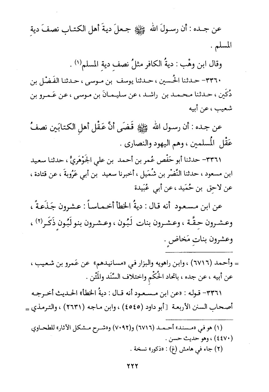 3360 - نا الْحُسَيْنُ بْنُ إِسْمَاعِيلَ , أنا يُوسُفُ بْنُ مُوسَى , أنا الْفَضْلُ بْنُ دُكَيْنٍ , نا مُحَمَّدُ بْنُ رَاشِدٍ , عَنْ سُلَيْمَانَ بْنِ مُوسَى , عَنْ عَمْرِو بْنِ شُعَيْبٍ , عَنْ أَبِيهِ , عَنْ جَدِّهِ , أَنَّ رَسُولَ اللَّهِ صَلَّى اللهُ عَلَيْهِ وَسَلَّمَ «قَضَى أَنَّ §عَقْلَ أَهْلِ الْكِتَابَيْنِ نِصْفَ عَقْلِ الْمُسْلِمِينَ». وَهُمُ الْيَهُودُ وَالنَّصَارَى