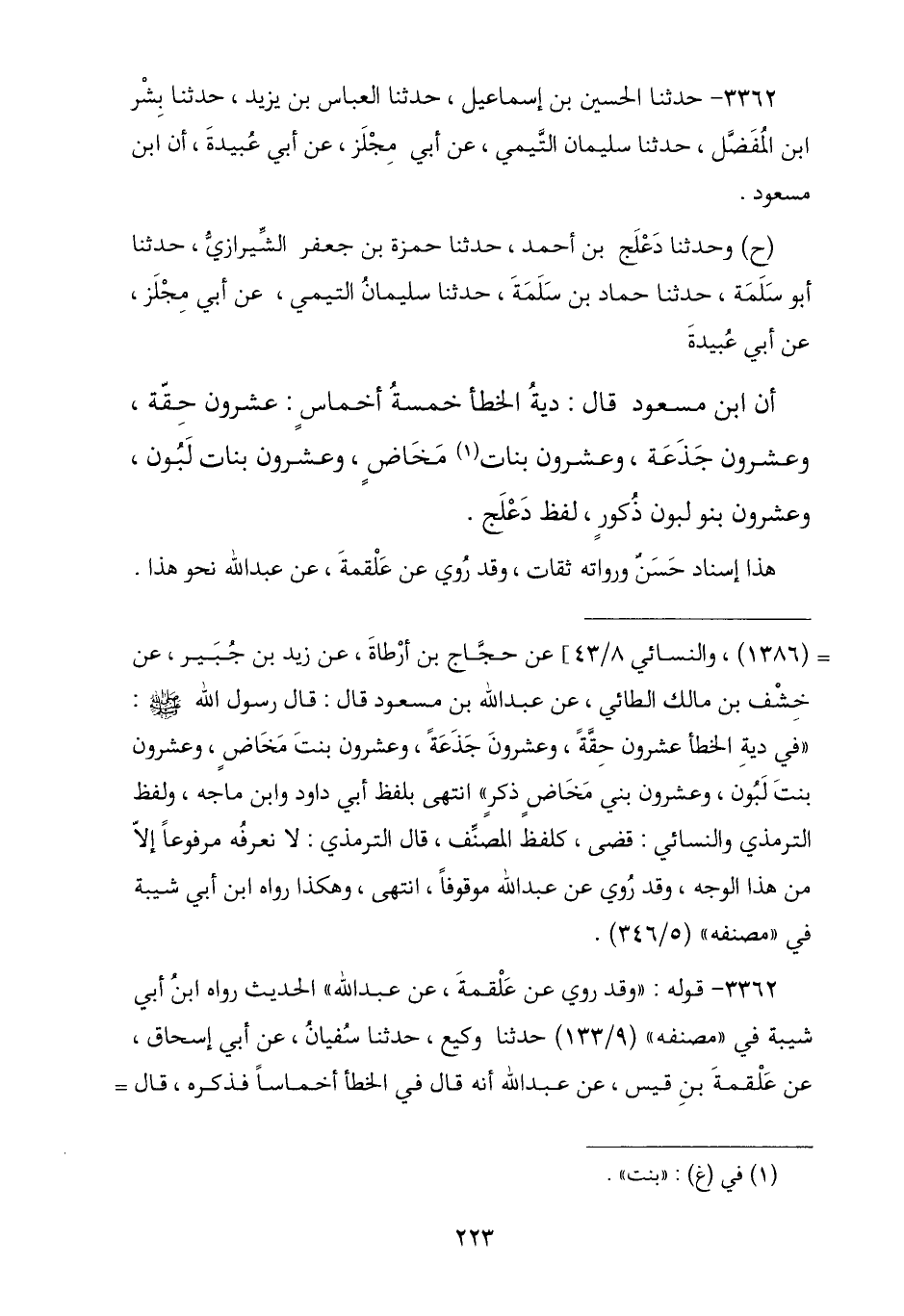 3362 - نا الْحُسَيْنُ بْنُ إِسْمَاعِيلَ , نا الْعَبَّاسُ بْنُ يَزِيدَ , نا بِشْرُ بْنُ الْمُفَضَّلِ , نا سُلَيْمَانُ التَّيْمِيُّ , عَنْ أَبِي مِجْلَزٍ , عَنْ أَبِي عُبَيْدَةَ , أَنَّ ابْنَ مَسْعُودٍ ح. وَنا دَعْلَجُ بْنُ أَحْمَدَ , نا حَمْزَةُ بْنُ جَعْفَرٍ الشِّيرَازِيُّ , ثنا أَبُو سَلَمَةَ , نا حَمَّادُ بْنُ سَلَمَةَ , نا سُلَيْمَانُ التَّيْمِيُّ , عَنْ أَبِي مِجْلَزٍ , عَنْ أَبِي عُبَيْدَةَ , أَنَّ ابْنَ مَسْعُودٍ , قَالَ: § «دِيَةُ الْخَطَأِ خَمْسَةُ أَخْمَاسٍ , عِشْرُونَ حِقَّةً , وَعِشْرُونَ جَذَعَةً , وَعِشْرُونَ بَنَاتِ مَخَاضٍ , وَعِشْرُونَ بَنَاتِ لَبُونٍ , وَعِشْرُونَ بَنُو لَبُونٍ ذُكُورٌ». لَفْظُ دَعْلَجٍ , وَهَذَا إِسْنَادٌ حَسَنٌ , وَرُوَاتُهُ ثِقَاتٌ. وَقَدْ رُوِيَ عَنْ عَلْقَمَةَ , عَنْ عَبْدِ اللَّهِ نَحْوَهُ. -[225]-