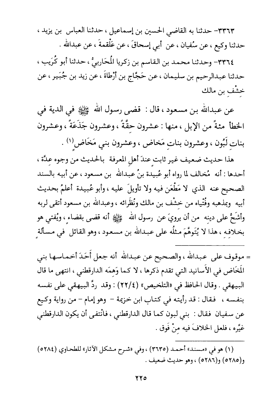 3364 - وَنا مُحَمَّدُ بْنُ الْقَاسِمِ بْنِ زَكَرِيَّا الْمُحَارِبِيُّ , نا أَبُو كُرَيْبٍ , نا عَبْدُ الرَّحِيمِ بْنُ سُلَيْمَانَ , عَنْ حَجَّاجِ بْنِ أَرْطَاةَ , عَنْ زَيْدِ بْنِ جُبَيْرٍ , عَنْ خِشْفِ بْنِ مَالِكٍ , عَنْ عَبْدِ اللَّهِ بْنِ مَسْعُودٍ , قَالَ: «قَضَى رَسُولُ اللَّهِ صَلَّى اللهُ عَلَيْهِ وَسَلَّمَ فِي §دِيَةِ الْخَطَأِ مِائَةً مِنَ الْإِبِلِ , مِنْهَا عِشْرُونَ حِقَّةً , وَعِشْرُونَ جَذَعَةً , وَعِشْرُونَ بَنَاتِ لَبُونٍ , وَعِشْرُونَ بَنَاتِ مَخَاضٍ , وَعِشْرُونَ بَنِي مَخَاضٍ». هَذَا حَدِيثٌ ضَعِيفٌ غَيْرُ ثَابِتٍ عِنْدَ أَهْلِ الْمَعْرِفَةِ بِالْحَدِيثِ , مِنْ وُجُوهٍ عِدَّةٍ أَحَدُهَا أَنَّهُ مُخَالِفٌ لَمَّا رَوَاهُ أَبُو عُبَيْدَةَ بْنُ عَبْدِ اللَّهِ بْنِ مَسْعُودٍ , عَنْ أَبِيهِ , بِالسِّنْدِ الصَّحِيحِ عَنْهُ الَّذِي لَا مَطْعَنَ فِيهِ , وَلَا تَأْوِيلَ عَلَيْهِ , وَأَبُو عُبَيْدَةَ أَعْلَمُ بِحَدِيثِ أَبِيهِ وَبِمَذْهَبِهِ وَفُتْيَاهُ مِنْ خِشْفِ بْنِ مَالِكٍ وَنُظَرَائِهِ , وَعَبْدُ اللَّهِ بْنُ مَسْعُودٍ أَتْقَى لِرَبِّهِ وَأَشَحُّ عَلَى دِينِهِ مِنْ أَنْ يَرْوِيَ عَنْ رَسُولِ اللَّهِ صَلَّى اللهُ عَلَيْهِ وَسَلَّمَ أَنَّهُ يَقْضِي بِقَضَاءٍ وَيُفْتِي هُوَ بِخِلَافِهِ , هَذَا لَا يُتَوَهَّمُ مِثْلُهُ عَلَى عَبْدِ اللَّهِ بْنِ مَسْعُودٍ , وَهُوَ الْقَائِلُ فِي مَسْأَلَةٍ -[226]- وَرَدَتْ عَلَيْهِ لَمْ يَسْمَعْ فِيهَا مِنْ رَسُولِ اللَّهِ صَلَّى اللهُ عَلَيْهِ وَسَلَّمَ شَيْئًا وَلَمْ يَبْلُغْهُ عَنْهُ فِيهَا قَوْلٌ: أَقُولُ فِيهَا بِرَأْيِي , فَإِنْ يَكُنْ صَوَابًا فَمِنَ اللَّهِ وَرَسُولِهِ , وَإِنْ يَكُنْ خَطَأً فَمِنِّي , ثُمَّ بَلَغَهُ بَعْدَ ذَلِكَ أَنَّ فُتْيَاهُ فِيهَا وَافَقَ قَضَاءَ رَسُولِ اللَّهِ صَلَّى اللهُ عَلَيْهِ وَسَلَّمَ فِي مِثْلِهَا فَرَآهُ أَصْحَابُهُ عِنْدَ ذَلِكَ فَرِحَ فَرَحًا لَمْ يَرَوْهُ فَرِحَ مِثْلَهُ مِنْ مُوَافَقَةِ فُتْيَاهُ قَضَاءَ رَسُولِ اللَّهِ صَلَّى اللهُ عَلَيْهِ وَسَلَّمَ , فَمَنْ كَانَتْ هَذِهِ صِفَتُهُ وَهَذَا حَالُهُ فَكَيْفَ يَصِحُّ عَنْهُ أَنْ يَرْوِي عَنْ رَسُولِ اللَّهِ صَلَّى اللهُ عَلَيْهِ وَسَلَّمَ شَيْئًا وَيُخَالِفُهُ. وَيَشْهَدُ أَيْضًا لِرِوَايَةِ أَبِي عُبَيْدَةَ بْنِ عَبْدِ اللَّهِ بْنِ مَسْعُودٍ , عَنْ أَبِيهِ , مَا رَوَاهُ وَكِيعٌ , وَعَبْدُ اللَّهِ بْنُ وَهْبٍ , وَغَيْرُهُمَا عَنْ سُفْيَانَ الثَّوْرِيِّ , عَنْ مَنْصُورٍ , عَنْ إِبْرَاهِيمَ , عَنْ عَبْدِ اللَّهِ بْنِ مَسْعُودٍ , أَنَّهُ قَالَ: «دِيَةُ الْخَطَأِ أَخْمَاسًا»