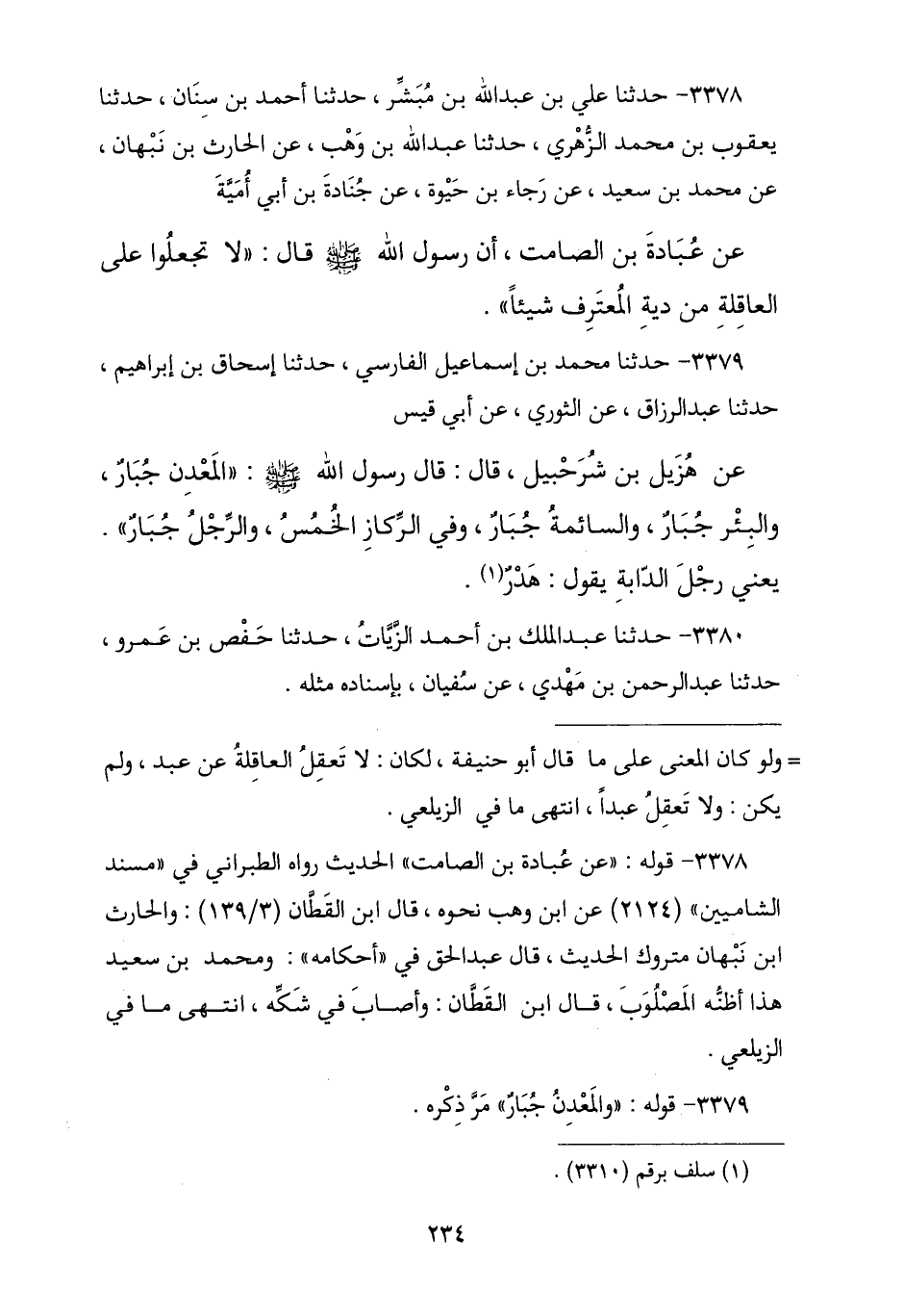 3378 - نا عَلِيُّ بْنُ عَبْدِ اللَّهِ بْنِ مُبَشِّرٍ , نا أَحْمَدُ بْنُ سِنَانٍ , نا يَعْقُوبُ بْنُ مُحَمَّدٍ الزُّهْرِيُّ , نا عَبْدُ اللَّهِ بْنُ وَهْبٍ , عَنِ الْحَارِثِ بْنِ نَبْهَانَ , عَنْ مُحَمَّدِ بْنِ سَعِيدٍ , عَنْ رَجَاءِ بْنِ حَيْوَةَ , عَنْ جُنَادَةَ بْنِ أَبِي أُمَيَّةَ , عَنْ عُبَادَةَ بْنِ الصَّامِتِ , أَنَّ رَسُولَ اللَّهِ صَلَّى اللهُ عَلَيْهِ وَسَلَّمَ قَالَ: § «لَا تَجْعَلُوا عَلَى الْعَاقِلَةِ مِنْ دِيَةِ الْمُعْتَرِفِ شَيْئًا»