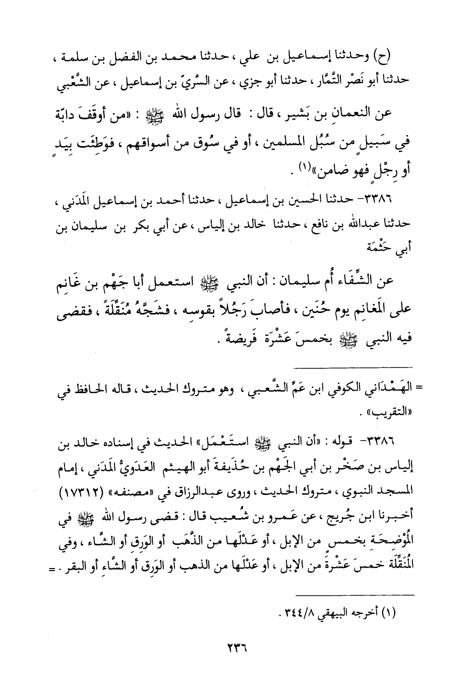 3386 - حَدَّثَنَا الْحُسَيْنُ بْنُ إِسْمَاعِيلَ , نا أَحْمَدُ بْنُ إِسْمَاعِيلَ الْمَدَنِيُّ , نا عَبْدُ اللَّهِ بْنُ نَافِعٍ , نا خَالِدُ بْنُ إِلْيَاسَ , عَنْ أَبِي بَكْرِ بْنِ سُلَيْمَانَ بْنِ أَبِي حَثْمَةَ , عَنِ الشِّفَاءِ أُمِّ سُلَيْمَانَ , أَنَّ النَّبِيَّ صَلَّى اللهُ عَلَيْهِ وَسَلَّمَ «اسْتَعْمَلَ أَبَا جَهْمِ بْنَ غَانِمٍ عَلَى الْمَغَانِمِ يَوْمَ حُنَيْنٍ» , §فَأَصَابَ رَجُلًا بِقَوْسِهِ فَشَجَّهُ مُنَقِّلَةً , «فَقَضَى فِيهِ رَسُولُ اللَّهِ صَلَّى اللهُ عَلَيْهِ وَسَلَّمَ بِخَمْسِ عَشْرَةَ فَرِيضَةً»