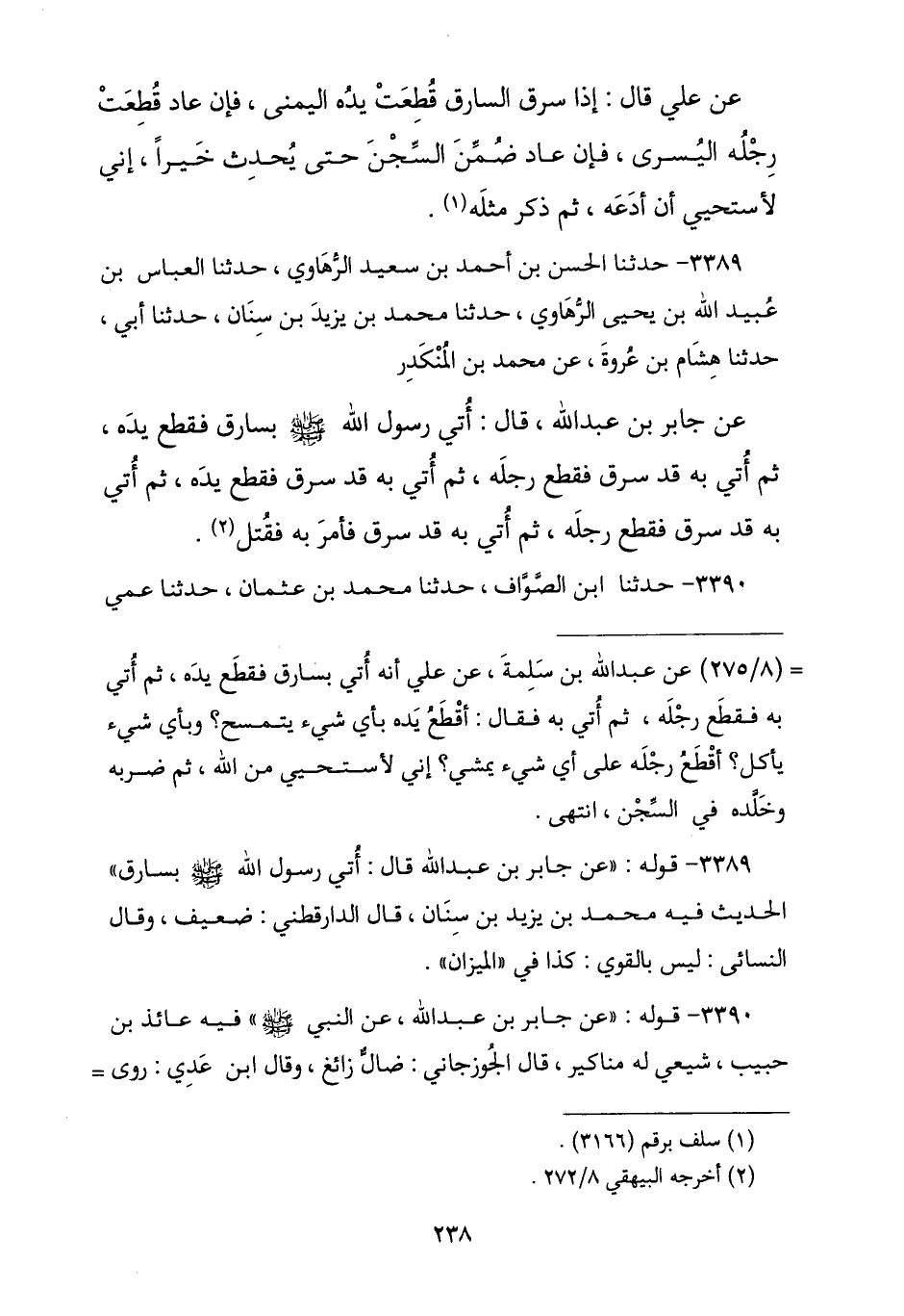 3389 - نا الْحَسَنُ بْنُ أَحْمَدَ بْنِ سَعِيدٍ الرَّهَاوِيُّ , نا الْعَبَّاسُ بْنُ عُبَيْدِ اللَّهِ بْنِ يَحْيَى الرَّهَاوِيُّ , نا مُحَمَّدُ بْنُ يَزِيدَ بْنِ سِنَانٍ , نا أَبِي , نا هِشَامُ بْنُ عُرْوَةَ , عَنْ مُحَمَّدِ بْنِ الْمُنْكَدِرِ , عَنْ جَابِرِ بْنِ عَبْدِ اللَّهِ , قَالَ: «أُتِيَ رَسُولُ اللَّهِ صَلَّى اللهُ عَلَيْهِ وَسَلَّمَ بِسَارِقٍ فَقَطَعَ يَدَهُ , ثُمَّ أُتِيَ بِهِ قَدْ سَرَقَ فَقَطَعَ رِجْلَهُ , ثُمَّ أُتِيَ بِهِ §قَدْ سَرَقَ فَقَطَعَ يَدَهُ , ثُمَّ أُتِيَ بِهِ قَدْ سَرَقَ فَقَطَعَ رِجْلَهُ , ثُمَّ أُتِيَ بِهِ قَدْ سَرَقَ فَأَمَرَ بِهِ فَقُتِلَ».