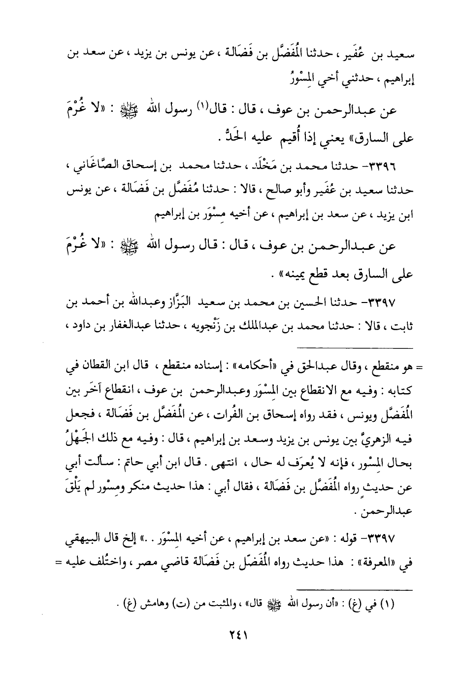 3398 - نا مُحَمَّدُ بْنُ مَخْلَدٍ , نا الرَّمَادِيُّ , نا أَبُو صَالِحٍ الْحَرَّانِيُّ عَبْدُ الْغَفَّارِ بْنُ دَاوُدَ , نا مُفَضَّلُ بْنُ فَضَالَةَ , عَنْ يُونُسَ بْنِ يَزِيدَ , عَنْ سَعدِ بْنِ إِبْرَاهِيمَ , قِصَّةَ عَبْدِ الرَّحْمَنِ بْنِ عَوْفٍ فِي السَّارِقِ. قَالَ أَبُو صَالِحٍ: قُلْتُ لِلْمُفَضَّلِ بْنِ فَضَالَةَ: يَا أَبَا مُعَاوِيَةَ إِنَّمَا هُوَ سَعْدُ بْنُ إِبْرَاهِيمَ , فَقَالَ: هَكَذَا حَدَّثَنِي , أَوْ , قَالَ: فِي كِتَابِي. سَعِيدُ بْنُ إِبْرَاهِيمَ مَجْهُولٌ , وَالْمِسْوَرُ بْنُ إِبْرَاهِيمَ لَمْ يُدْرِكْ عَبْدَ الرَّحْمَنِ بْنَ عَوْفٍ , وَإِنْ صَحَّ إِسْنَادُهُ كَانَ مُرْسَلًا , وَاللَّهُ أَعْلَمُ