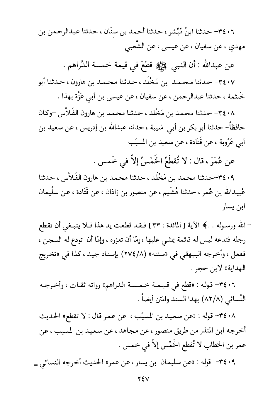 3409 - نا مُحَمَّدُ بْنُ مَخْلَدٍ , نا مُحَمَّدُ بْنُ هَارُونَ الْفَلَّاسُ , نا عُبَيْدُ اللَّهِ بْنُ عُمَرَ , نا هُشَيْمٌ , عَنْ مَنْصُورِ بْنِ زَاذَانٍ , عَنْ قَتَادَةَ , عَنْ سُلَيْمَانَ بْنِ يَسَارٍ , -[248]- عَنْ عُمَرَ , قَالَ: § «لَا تُقْطَعُ الْخَمْسُ إِلَّا فِي خَمْسٍ»