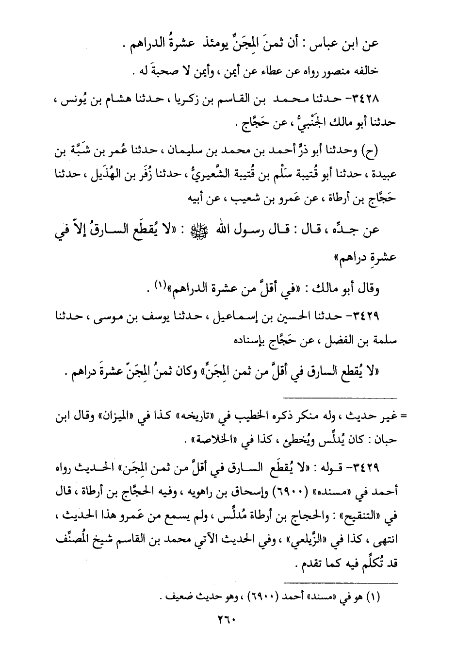 3429 - نا الْحُسَيْنُ بْنُ إِسْمَاعِيلَ , نا يُوسُفُ بْنُ مُوسَى , نا سَلَمَةُ بْنُ الْفَضْلِ , عَنْ حَجَّاجٍ , بِإِسْنَادِهِ: § «لَا يُقْطَعُ السَّارِقُ فِي أَقَلَّ مِنْ ثَمَنِ الْمِجَنِّ». وَكَانَ ثَمَنُ الْمِجَنِّ عَشْرَةَ دَرَاهِمَ