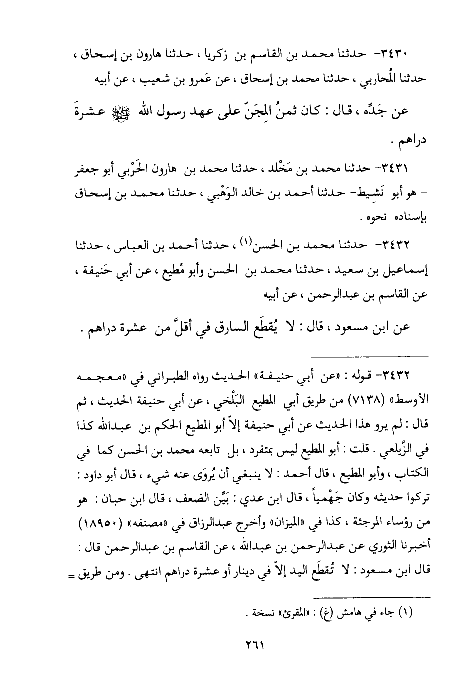 3433 - نا مُحَمَّدُ بْنُ الْحَسَنِ , نا أَحْمَدُ بْنُ الْعَبَّاسِ , نا إِسْمَاعِيلُ بْنُ إِدْرِيسَ , عَنِ الْمَسْعُودِيِّ , عَنِ الْقَاسِمِ , قَالَ: قَالَ عَبْدُ اللَّهِ مِثْلَهُ , أَرْسَلَهُ الْمَسْعُودِيُّ. وَقَالَ الشَّعْبِيُّ: عَنِ ابْنِ مَسْعُودٍ أَنَّ النَّبِيَّ صَلَّى اللهُ عَلَيْهِ وَسَلَّمَ «قَطَعَ فِي خَمْسَةِ دَرَاهِمَ»