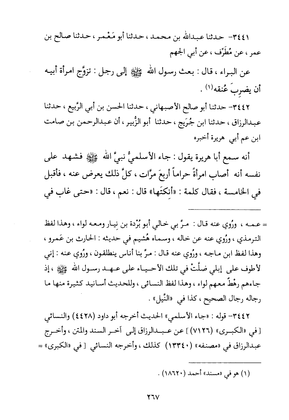 3441 - نا عَبْدُ اللَّهِ بْنُ مُحَمَّدٍ , ثنا أَبُو مَعْمَرٍ , نا صَالِحُ بْنُ عُمَرَ , عَنْ مُطَرِّفٍ , عَنْ أَبِي الْجَهْمِ , عَنِ الْبَرَاءِ , قَالَ: بَعَثَ رَسُولُ اللَّهِ صَلَّى اللهُ عَلَيْهِ وَسَلَّمَ إِلَى §رَجُلٍ تَزَوَّجَ امْرَأَةَ أَبِيهِ: «أَنْ يَضْرِبَ عُنُقَهُ»