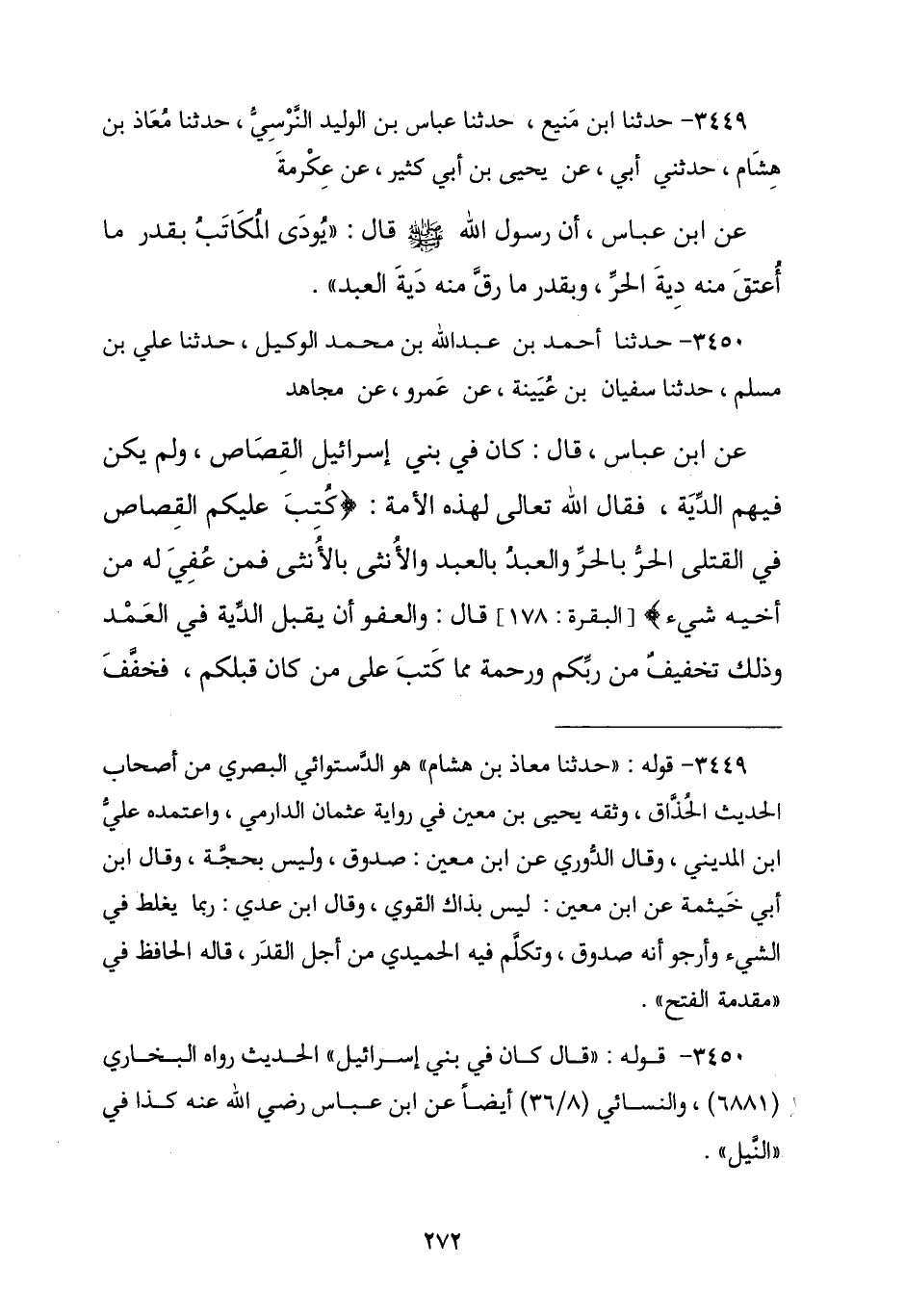 3450 - نا أَحْمَدُ بْنُ عَبْدِ اللَّهِ بْنِ مُحَمَّدٍ الْوَكِيلُ , نا عَلِيُّ بْنُ مُسْلِمٍ , نا سُفْيَانُ بْنُ عُيَيْنَةَ , عَنْ عَمْرٍو , عَنْ مُجَاهِدٍ , عَنِ ابْنِ عَبَّاسٍ , قَالَ: كَانَ فِي بَنِي إِسْرَائِيلَ الْقِصَاصُ , وَلَمْ يَكُنْ فِيهِمُ الدِّيَةُ , فَقَالَ اللَّهُ تَعَالَى لِهَذِهِ الْأُمَّةِ: {كُتِبَ عَلَيْكُمُ الْقِصَاصُ فِي الْقَتْلَى الْحُرُّ بِالْحُرِّ وَالْعَبْدُ بِالْعَبْدِ وَالْأُنْثَى بِالْأُنْثَى فَمَنْ عُفِيَ لَهُ مِنْ أَخِيهِ شَيْءٌ} [البقرة: 178] , قَالَ: " §فَالْعَفْوُ أَنْ يَقْبَلَ الدِّيَةَ فِي الْعَمْدِ , وَ {ذَلِكَ تَخْفِيفٌ مِنْ رَبِّكُمْ وَرَحْمَةٌ} [البقرة: 178]-[273]- أَنْ يَقْبَلُوا الدِّيَةَ فِي الْعَمْدِ , {فَاتِّبَاعٌ بِالْمَعْرُوفِ} [البقرة: 178] يَتِّبِعُ ذَا بِالْمَعْرُوفِ , وَيُؤَدِّي ذَا بِإِحْسَانٍ "