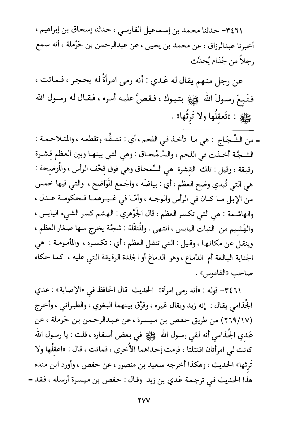 3461 - نا مُحَمَّدُ بْنُ إِسْمَاعِيلَ الْفَارِسِيُّ , نا إِسْحَاقُ بْنُ إِبْرَاهِيمَ , نا عَبْدُ الرَّزَّاقِ , عَنْ مُحَمَّدِ بْنِ يَحْيَى , عَنْ عَبْدِ الرَّحْمَنِ بْنِ حَرْمَلَةَ , أَنَّهُ سَمِعَ رَجُلًا مِنْ جُذَامٍ , يُحَدِّثُ عَنْ رَجُلٍ مِنْهُمْ يُقَالُ لَهُ عَدِيٌّ: أَنَّهُ رَمَى امْرَأَةً لَهُ بِحَجَرٍ فَمَاتَتْ , فَتَبِعَ رَسُولَ اللَّهِ صَلَّى اللهُ عَلَيْهِ وَسَلَّمَ بِتَبُوكَ فَقَصَّ عَلَيْهِ أَمْرَهُ , فَقَالَ لَهُ رَسُولُ اللَّهِ صَلَّى اللهُ عَلَيْهِ وَسَلَّمَ: § «تَعْقِلُهَا وَلَا تَرِثُهَا»