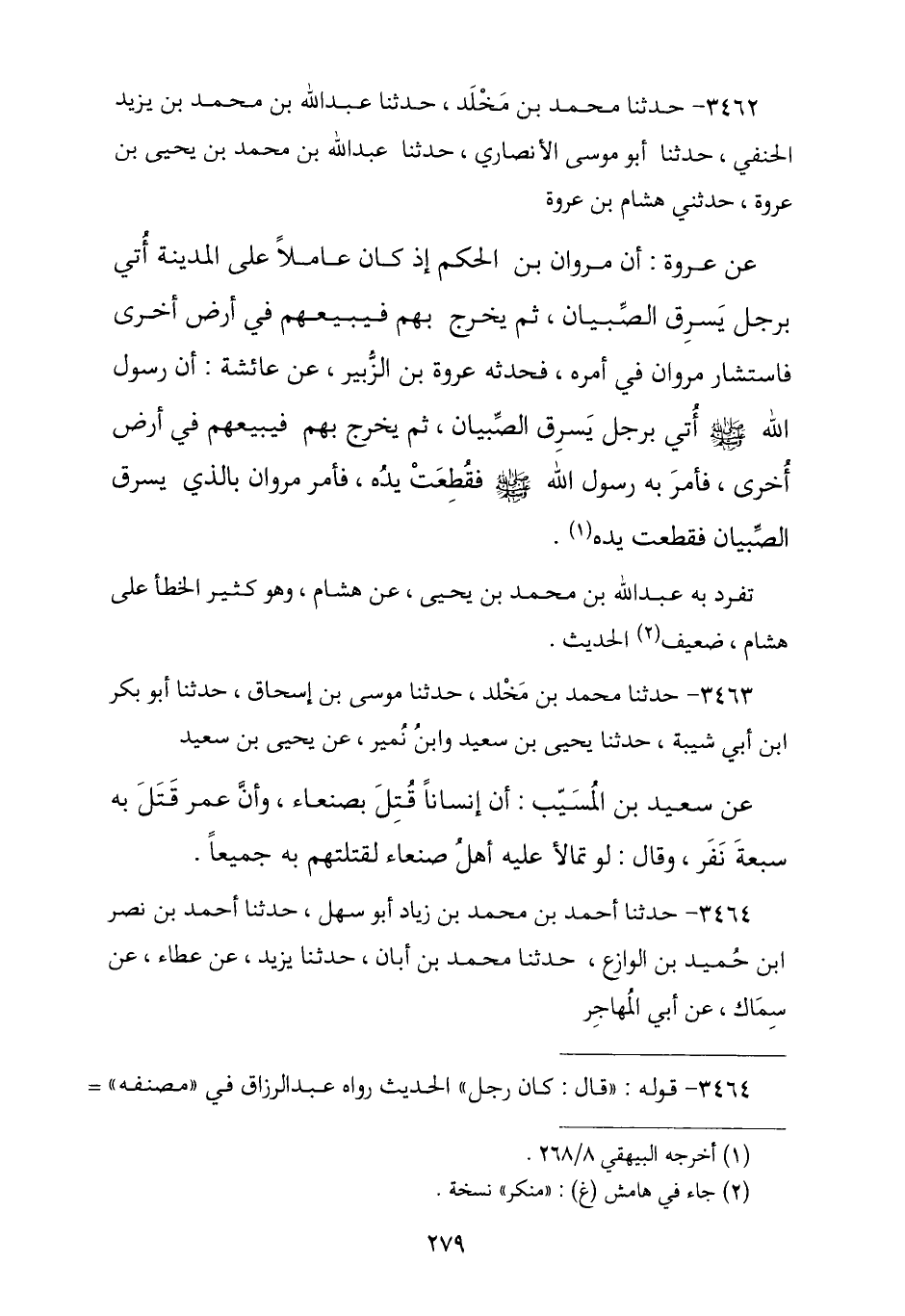 3462 - نا مُحَمَّدُ بْنُ مَخْلَدٍ , نا عَبْدُ اللَّهِ بْنُ مُحَمَّدِ بْنِ يَزِيدَ الْحَنَفِيُّ , نا أَبُو مُوسَى الْأَنْصَارِيُّ , نا عَبْدُ اللَّهِ بْنُ مُحَمَّدِ بْنِ يَحْيَى بْنِ عُرْوَةَ , حَدَّثَنِي هِشَامُ بْنُ عُرْوَةَ , عَنْ عُرْوَةَ , أَنَّ مَرْوَانَ بْنَ الْحَكَمِ إِذْ كَانَ عَامِلًا عَلَى الْمَدِينَةِ أُتِيَ بِرَجُلٍ يَسْرِقُ الصِّبْيَانَ ثُمَّ يَخْرُجُ بِهِمْ فَيَبِيعَهُمْ فِي أَرْضٍ أُخْرَى , فَاسْتَشَارَ مَرْوَانُ فِي أَمْرِهِ , فَحَدَّثَهُ عُرْوَةُ بْنُ الزُّبَيْرِ , عَنْ عَائِشَةَ رَضِيَ اللَّهُ عَنْهَا , أَنَّ رَسُولَ اللَّهِ صَلَّى اللهُ عَلَيْهِ وَسَلَّمَ أُتِيَ بِرَجُلٍ يَسْرِقُ الصِّبْيَانَ ثُمَّ يَخْرُجُ بِهِمْ فَيَبِيعَهُمْ فِي أَرْضٍ أُخْرَى , فَأَمَرَ بِهِ رَسُولُ اللَّهِ صَلَّى اللهُ عَلَيْهِ وَسَلَّمَ § «فَقُطِعَتْ يَدُهُ» , فَأَمَرَ مَرْوَانُ بِالَّذِي يَسْرِقُ الصِّبْيَانَ فَقُطِعَتْ يَدُهُ. تَفَرَّدَ بِهِ عَبْدُ اللَّهِ بْنُ مُحَمَّدِ بْنِ يَحْيَى , عَنْ هِشَامٍ , وَهُوَ كَثِيرُ الْخَطَأِ , عَلَى هِشَامٍ وَهُوَ ضَعِيفُ الْحَدِيثِ