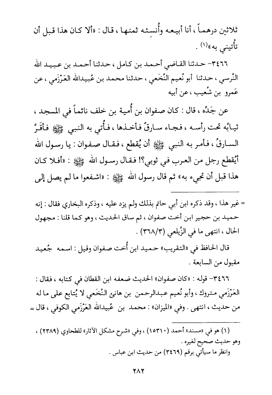 3466 - نا الْقَاضِي أَحْمَدُ بْنُ كَامِلٍ , نا أَحْمَدُ بْنُ عُبَيدِ اللَّهِ الْنُرْسِيُّ , نا أَبُو نُعَيْمٍ النَّخَعِيُّ , نا مُحَمَّدُ بْنُ عُبَيْدِ اللَّهِ الْعَرْزَمِيُّ , عَنْ عَمْرِو بْنِ شُعَيْبٍ , عَنْ أَبِيهِ , عَنْ جَدِّهِ , قَالَ: كَانَ صَفْوَانُ بْنُ أُمَيَّةَ بْنِ خَلَفٍ نَائِمًا فِي الْمَسْجِدِ , ثِيَابُهُ تَحْتَ رَأْسِهِ , فَجَاءَ سَارِقٌ فَأَخَذَهَا , فَأُتِيَ بِهِ النَّبِيُّ صَلَّى اللهُ عَلَيْهِ وَسَلَّمَ فَأَقَرَّ السَّارِقُ , فَأَمَرَ بِهِ النَّبِيُّ صَلَّى اللهُ عَلَيْهِ وَسَلَّمَ أَنْ يُقْطَعَ , فَقَالَ صَفْوَانُ: يَا رَسُولَ اللَّهِ أَيُقْطَعُ رَجُلٌ مِنَ الْعَرَبِ فِي ثَوْبِي؟ , فَقَالَ رَسُولُ اللَّهِ صَلَّى اللهُ عَلَيْهِ وَسَلَّمَ: «أَفَلَا كَانَ هَذَا قَبْلَ أَنْ تَجِيءَ بِهِ» , ثُمَّ قَالَ رَسُولُ اللَّهِ صَلَّى اللهُ عَلَيْهِ وَسَلَّمَ: § «اشْفَعُوا مَا لَمْ يَتَّصِلْ إِلَى -[283]- الْوَالِي , فَإِذَا أُوصِلَ إِلَى الْوَالِي فَعَفَا فَلَا عَفَا اللَّهُ عَنْهُ» , ثُمَّ أَمَرَ بِقَطْعِهِ مِنَ الْمِفْصَلِ