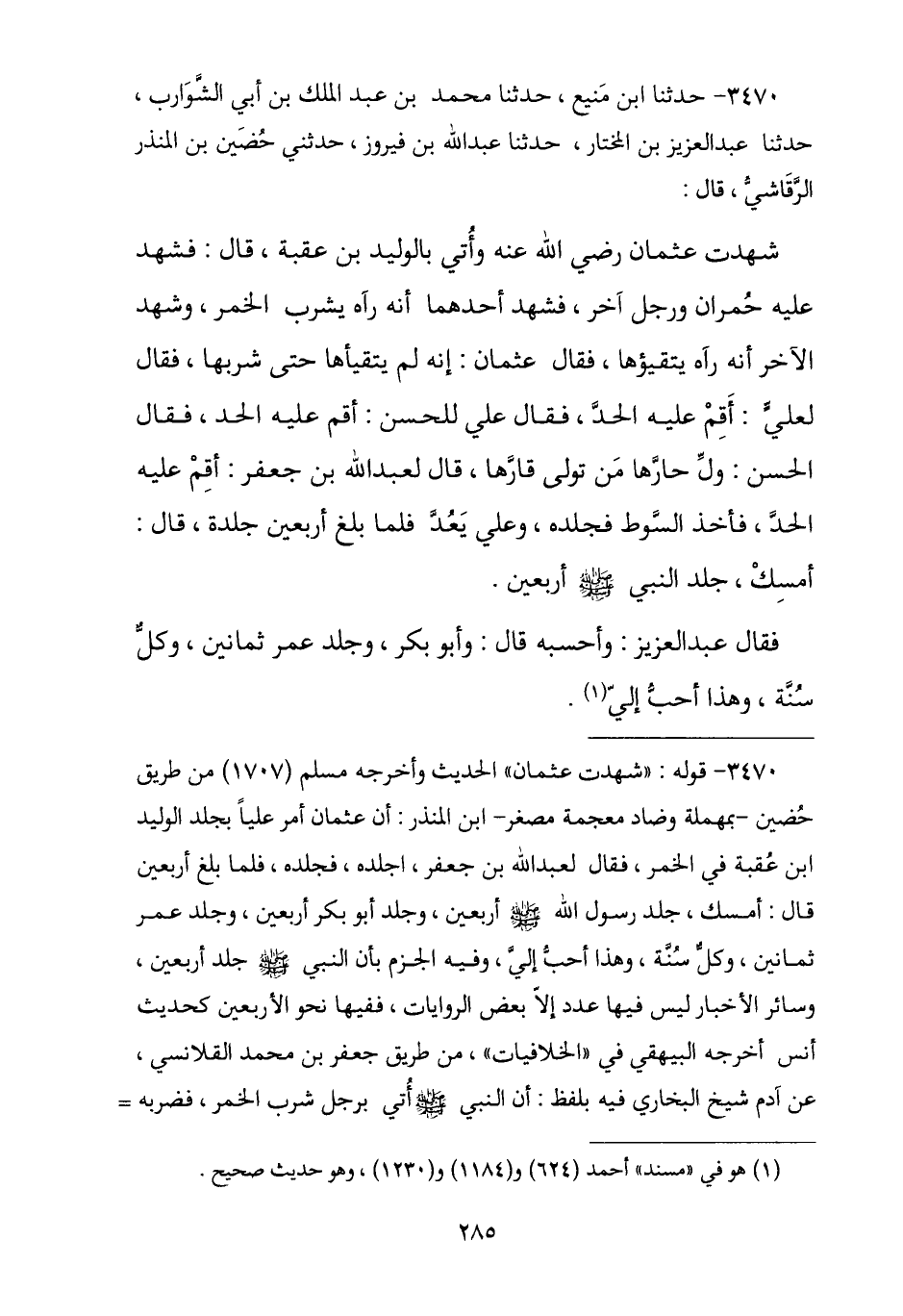 3470 - نا ابْنُ مَنِيعٍ , نا مُحَمَّدُ بْنُ عَبْدِ الْمَلِكِ بْنِ أَبِي الشَّوَارِبِ , نا عَبْدُ الْعَزِيزِ بْنُ الْمُخْتَارِ , نا عَبْدُ اللَّهِ بْنُ فَيْرُوزَ , حَدَّثَنِي حُضَيْنُ بْنُ الْمُنْذِرِ الرَّقَاشِيُّ , قَالَ: شَهِدْتُ عُثْمَانَ رَضِيَ اللَّهُ عَنْهُ وَأُتِيَ بِالْوَلِيدِ بْنِ عُقْبَةَ , قَالَ: فَشَهِدَ عَلَيْهِ حُمْرَانُ وَرَجُلٌ آخَرُ , فَشَهِدَ أَحَدُهُمَا أَنَّهُ رَآهُ يَشْرَبُ الْخَمْرَ , وَشَهِدَ الْآخَرُ أَنَّهُ رَآهُ يَتَقَيَّؤُهَا , فَقَالَ عُثْمَانُ: إِنَّهُ §لَمْ يَتَقَيَّأْهَا حَتَّى شَرِبَهَا , فَقَالَ لِعَلِيٍّ عَلَيْهِ السَّلَامُ: أَقِمْ عَلَيْهِ الْحَدَّ , فَقَالَ عَلِيُّ لِلْحَسَنِ: «أَقِمْ عَلَيْهِ الْحَدَّ» , فَقَالَ الْحَسَنُ: وَلِّ حَارَّهَا مَنْ تَوَلَّى قَارَّهَا , قَالَ لِعَبْدِ اللَّهِ بْنِ جَعْفَرٍ: «أَقِمْ عَلَيْهِ الْحَدَّ» , فَأَخَذَ السَّوْطَ فَجَلَدَهُ , وَعَلِيٌّ يَعُدُّ حَتَّى بَلَغَ أَرْبَعِينَ جَلْدَةً , قَالَ: «أَمْسِكْ؛ جَلْدَ النَّبِيُّ صَلَّى اللهُ عَلَيْهِ وَسَلَّمَ أَرْبَعِينَ». قَالَ عَبْدُ الْعَزِيزِ: أَحْسَبُهُ , قَالَ: «وَأَبُو بَكْرٍ , وَجَلَدَ عُمَرُ ثَمَانِينَ , وَكُلٌّ سُنَّةٌ , وَهَذَا أَحَبُّ إِلَيَّ»