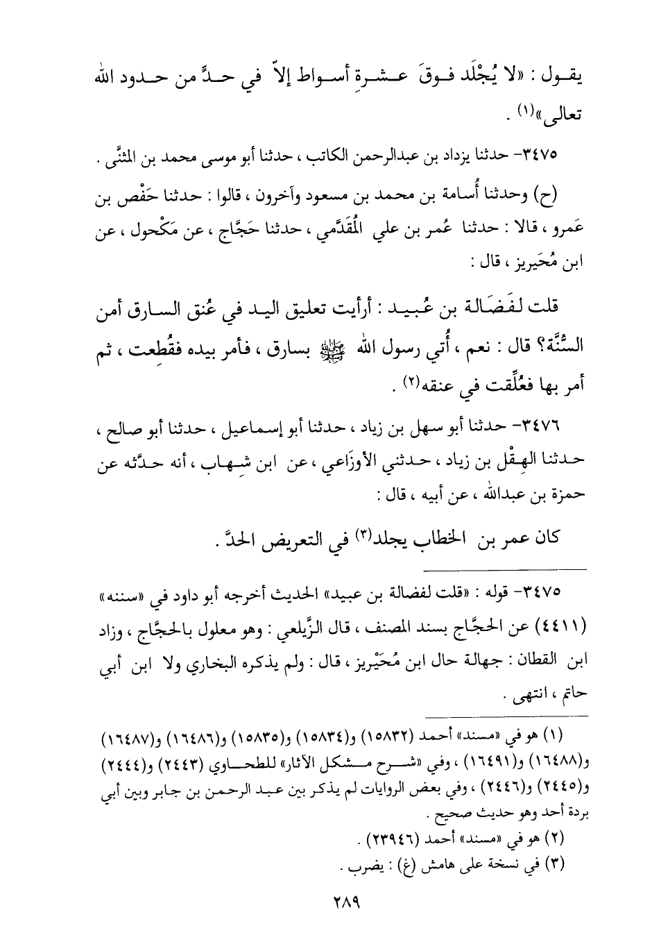 3475 - نا يَزْدَادُ بْنُ عَبْدِ الرَّحْمَنِ الْكَاتِبُ , نا أَبُو مُوسَى مُحَمَّدُ بْنُ الْمُثَنَّى , ح وَنا أُسَامَةُ بْنُ مُحَمَّدِ بْنِ مَسْعُودٍ , وَآخَرُونَ , قَالُوا: نا حَفْصُ بْنُ عَمْرٍو , قَالَا: نا عُمَرُ بْنُ عَلِيٍّ الْمُقَدِميُّ , نا حَجَّاجٌ , عَنْ مَكْحُولٍ , عَنْ ابْنِ مُحَيْرِيزٍ , قَالَ: قُلْتُ لِفَضَالَةَ بْنِ عُبَيْدٍ: أَرَأَيْتَ تَعْلِيقَ الْيَدِ فِي عُنُقِ السَّارِقِ أَمِنَ السُّنَّةِ؟ , قَالَ: نَعَمْ , إِنَّ رَسُولَ اللَّهِ صَلَّى اللهُ عَلَيْهِ وَسَلَّمَ «أُتِيَ بِسَارِقٍ §فَأَمَرِ بِيَدِهِ فَقُطِعَتْ , ثُمَّ أَمَرَ بِهَا فَعُلِّقَتْ فِي عُنُقِهِ»