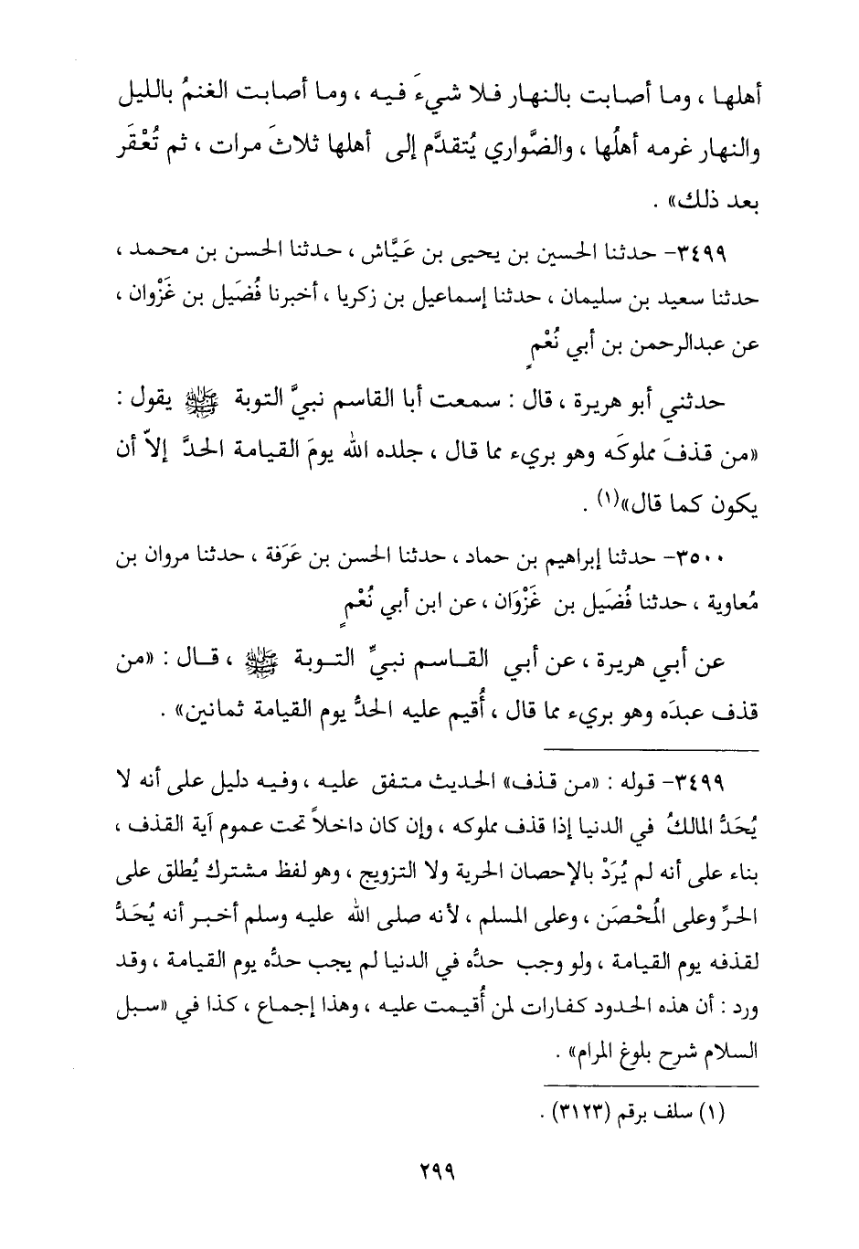 3499 - نا الْحُسَيْنُ بْنُ يَحْيَى بْنِ عَيَّاشٍ , نا الْحَسَنُ بْنُ مُحَمَّدٍ , نا سَعِيدُ بْنُ سُلَيْمَانَ , نا إِسْمَاعِيلُ بْنُ زَكَرِيَّا , نا فُضَيْلُ بْنُ غَزْوَانَ , عَنْ عَبْدِ الرَّحْمَنِ بْنِ أَبِي نُعْمٍ , حَدَّثَنِي أَبُو هُرَيْرَةَ , قَالَ سَمِعْتُ أَبَا الْقَاسِمِ نَبِيَّ التَّوْبَةِ صَلَّى اللهُ عَلَيْهِ وَسَلَّمَ , يَقُولُ: § «مَنْ قَذَفَ مَمْلُوكَهُ وَهُوَ بَرِيءٌ مِمَّا قَالَ جَلَدَهُ اللَّهُ يَوْمَ الْقِيَامَةِ الْحَدَّ , إِلَّا أَنْ يَكُونَ كَمَا قَالَ»