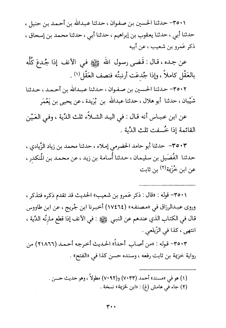 3501 - نا الْحُسَيْنُ بْنُ صَفْوَانَ , نا عَبْدُ اللَّهِ بْنُ أَحْمَدَ , نا أَبِي , نا يَعْقُوبُ بْنُ إِبْرَاهِيمَ , حَدَّثَنِي أَبِي , نا مُحَمَّدُ بْنُ إِسْحَاقَ , قَالَ: ذَكَرَ عَمْرُو بْنُ شُعَيْبٍ , عَنْ أَبِيهِ , عَنْ جَدِّهِ , قَالَ: «قَضَى رَسُولُ اللَّهِ صَلَّى اللهُ عَلَيْهِ وَسَلَّمَ فِي §الْأَنْفِ إِذَا جُدِعَ كُلُّهُ بِالْعَقْلِ كَامِلًا , وَإِذَا جُدِعَتْ أَرْنَبَتُهُ فَنِصْفُ الْعَقْلِ»