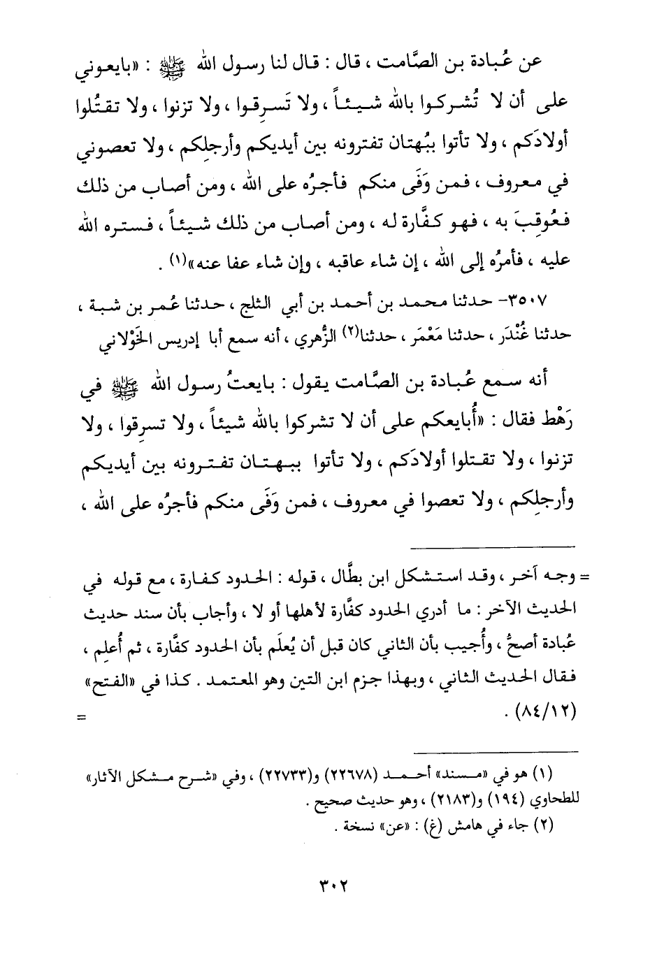 3507 - نا مُحَمَّدُ بْنُ أَحْمَدَ بْنِ أَبِي الثَّلْجِ , نا عُمَرُ بْنُ شَبَّةَ , نا غُنْدَرٌ , نا مَعْمَرٌ , عَنِ الزُّهْرِيِّ , أَنَّهُ سَمِعَ أَبَا إِدْرِيسَ الْخَوْلَانِيَّ , أَنَّهُ سَمِعَ عُبَادَةَ بْنَ الصَّامِتِ , يَقُولُ: بَايَعْتُ رَسُولَ اللَّهِ صَلَّى اللهُ عَلَيْهِ وَسَلَّمَ فِي رَهْطٍ , فَقَالَ: " أُبَايِعُكُمْ عَلَى أَنْ §لَا تُشْرِكُوا بِاللَّهِ شَيْئًا , وَلَا تَسْرِقُوا , وَلَا تَزْنُوا , وَلَا تَقْتُلُوا أَوْلَادَكُمْ , وَلَا تَأْتُوا بِبُهْتَانٍ تَفْتَرُونَهُ بَيْنَ أَيْدِيكُمْ وَأَرْجُلِكُمْ , وَلَا تَعْصُونِي فِي مَعْرُوفٍ , فَمَنْ وَفَّى مِنْكُمْ فَأَجْرُهُ عَلَى اللَّهِ -[303]- تَعَالَى , وَمَنْ أَصَابَ مِنْ ذَلِكَ شَيْئًا يَعْنِي: فَأُقِيمَ عَلَيْهِ الْحَدُّ فَهُوَ لَهُ طُهُورٌ , وَمَنْ سَتَرَهُ اللَّهُ تَعَالَى فَذَلِكَ إِلَى اللَّهِ , إِنْ شَاءَ عَذَّبَهُ , وَإِنْ شَاءَ غَفَرَ لَهُ ".