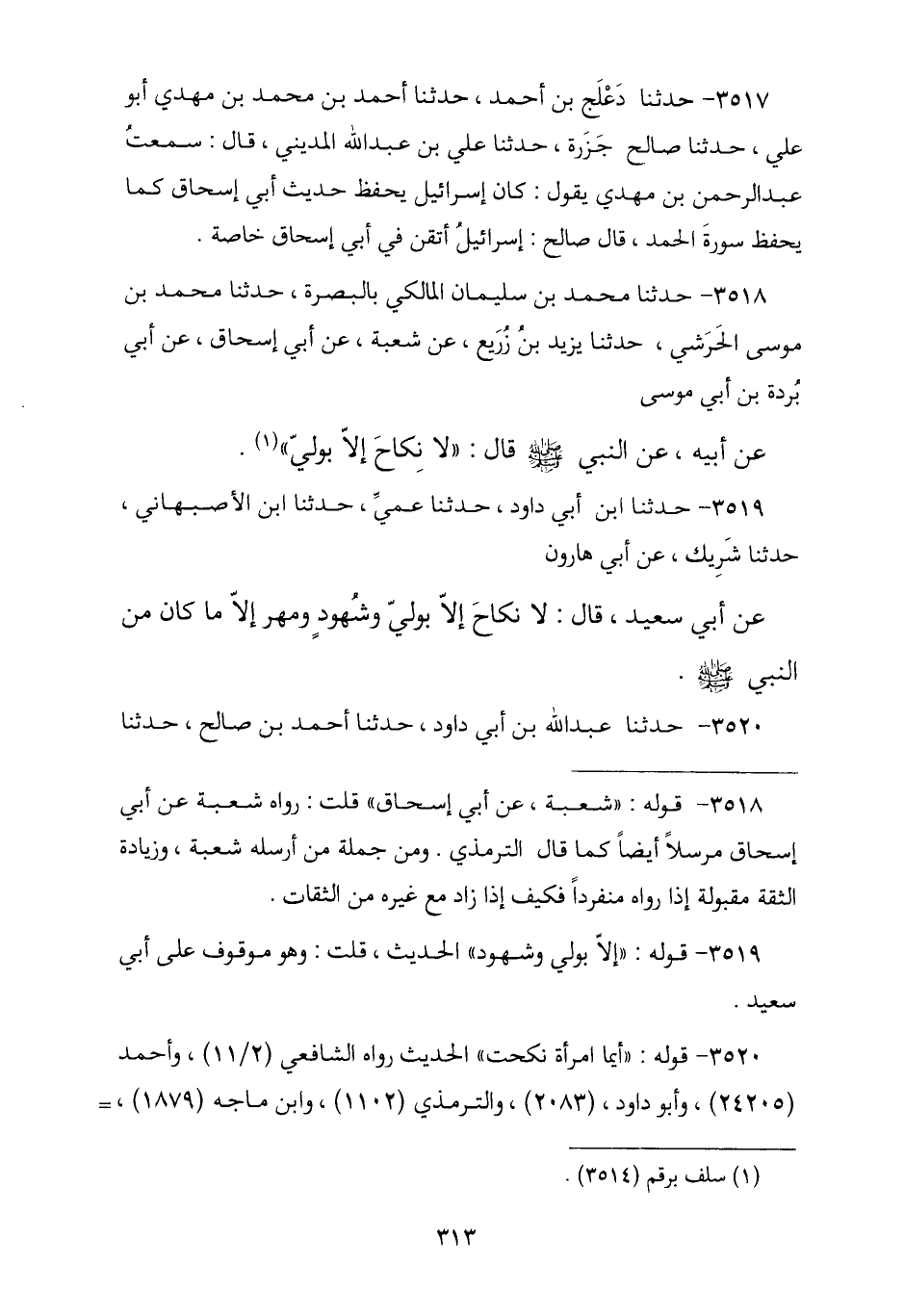 3518 - نا مُحَمَّدُ بْنُ سُلَيْمَانَ الْمَالِكِيُّ بِالْبَصْرَةِ , نا مُحَمَّدُ بْنُ مُوسَى الْحَرَشِيُّ , نا يَزِيدُ بْنُ زُرَيْعٍ , نا شُعْبَةُ , عَنْ أَبِي إِسْحَاقَ , عَنْ أَبِي بُرْدَةَ , عَنْ أَبِيهِ , عَنِ النَّبِيِّ صَلَّى اللهُ عَلَيْهِ وَسَلَّمَ , قَالَ: § «لَا نِكَاحَ إِلَّا بِوَلِيٍّ»