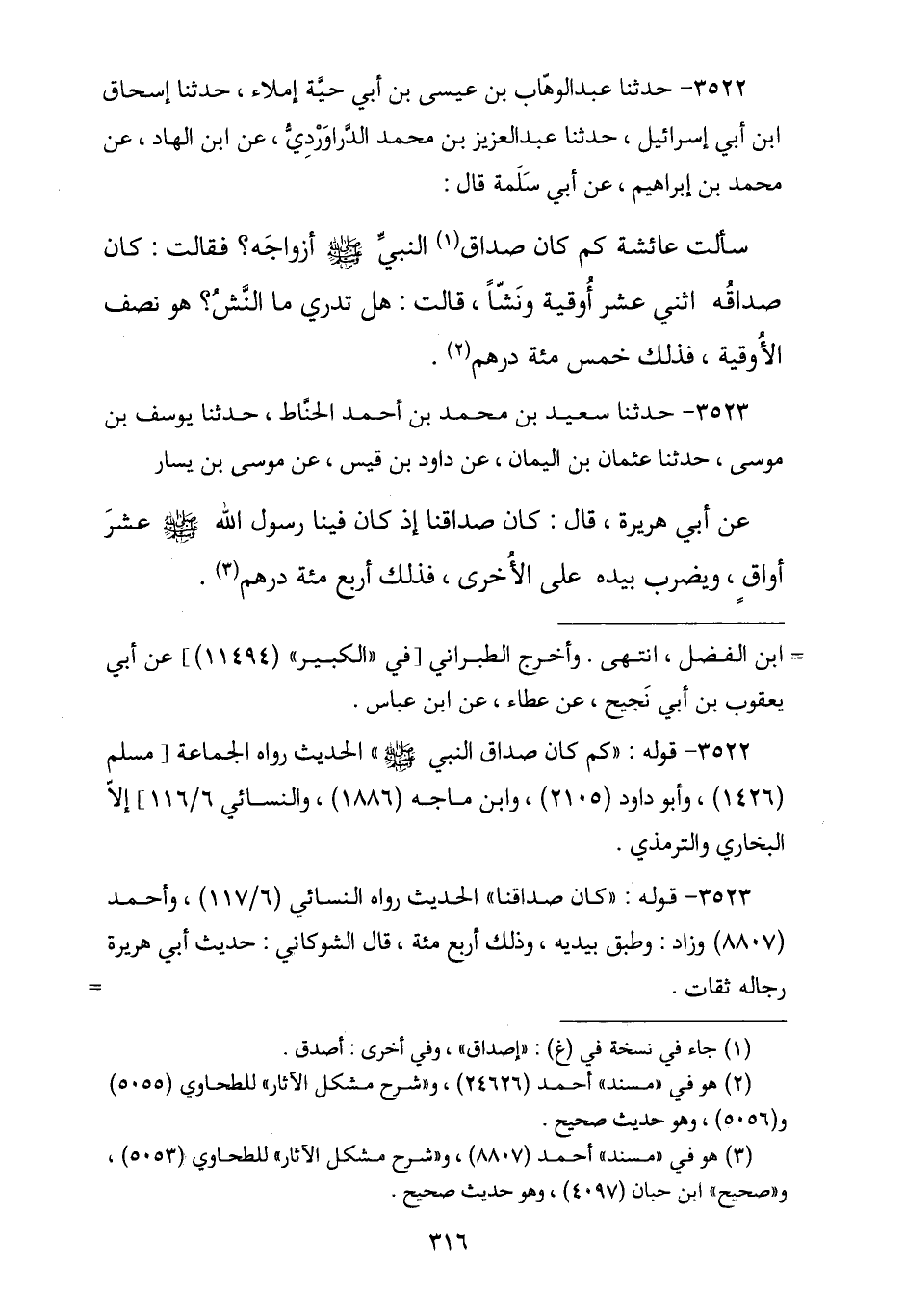 3522 - نا عَبْدُ الْوَهَّابِ بْنُ عِيسَى بْنِ أَبِي حَيَّةَ إِمْلَاءً , نا إِسْحَاقُ بْنُ أَبِي إِسْرَائِيلَ , نا عَبْدُ الْعَزِيزِ بْنُ مُحَمَّدٍ الدَّرَاوَرْدِيُّ , عَنِ ابْنِ الْهَادِ , عَنْ مُحَمَّدِ بْنِ إِبْرَاهِيمَ , عَنْ أَبِي سَلَمَةَ , قَالَ: سَأَلْتُ عَائِشَةَ كَمْ كَانَ صَدَاقُ النَّبِيِّ صَلَّى اللهُ عَلَيْهِ وَسَلَّمَ أَزْوَاجَهُ؟ , فَقَالَتْ: «§كَانَ صَدَاقُهُ اثْنَيْ عَشَرَ أُوقِيَّةٍ وَنَشٍّ» , قَالَتْ: «هَلْ تَدْرِي مَا النَّشُّ؟ هُوَ نِصْفُ الْأُوقِيَّةِ , فَذَلِكَ خَمْسُمِائَةِ دِرْهَمٍ»