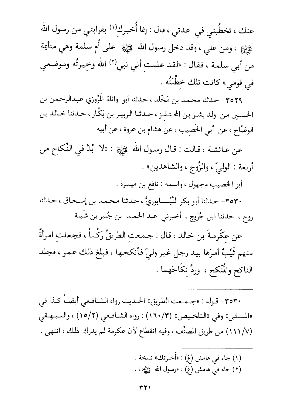 3529 - نا مُحَمَّدُ بْنُ مَخْلَدٍ , نا أَبُو وَائِلَةَ الْمَرْوَزِيُّ عَبْدُ الرَّحْمَنِ بْنُ الْحُسَيْنِ مِنْ وَلَدِ بِشْرِ بْنِ الْمُحْتَفِزِ , نا الزُّبَيْرُ بْنُ بَكَّارٍ , نا خَالِدُ بْنُ الْوَضَّاحِ , عَنْ أَبِي الْخَصِيبِ , عَنْ هِشَامٍ , عَنْ عُرْوَةَ , عَنْ أَبِيهِ , عَنْ عَائِشَةَ , قَالَتْ: قَالَ رَسُولُ اللَّهِ صَلَّى اللهُ عَلَيْهِ وَسَلَّمَ: " §لَا بُدَّ فِي النِّكَاحِ مِنْ أَرْبَعَةٍ: الْوَلِيِّ وَالزَّوْجِ وَالشَّاهِدَيْنِ " أَبُو الْخَصِيبِ مَجْهُولٌ وَاسْمُهُ: نَافِعُ بْنُ مَيْسَرَةَ