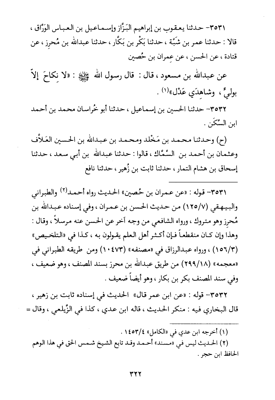 3531 - نا يَعْقُوبُ بْنُ إِبْرَاهِيمَ الْبَزَّارُ , وَإِسْمَاعِيلُ بْنُ الْعَبَّاسِ الْوَرَّاقُ , قَالَا: نا عُمَرُ بْنُ شَبَّةَ , نا بَكْرُ بْنُ بَكَّارٍ , نا عَبْدُ اللَّهِ بْنُ مُحْرِزٍ , عَنْ قَتَادَةَ , عَنِ الْحَسَنِ , عَنْ عِمْرَانَ بْنِ حُصَيْنٍ , عَنْ عَبْدِ اللَّهِ بْنِ مَسْعُودٍ , قَالَ: قَالَ رَسُولُ اللَّهِ صَلَّى اللهُ عَلَيْهِ وَسَلَّمَ: § «لَا نِكَاحَ إِلَّا بِوَلِيٍّ وَشَاهِدَيْ عَدْلٍ»