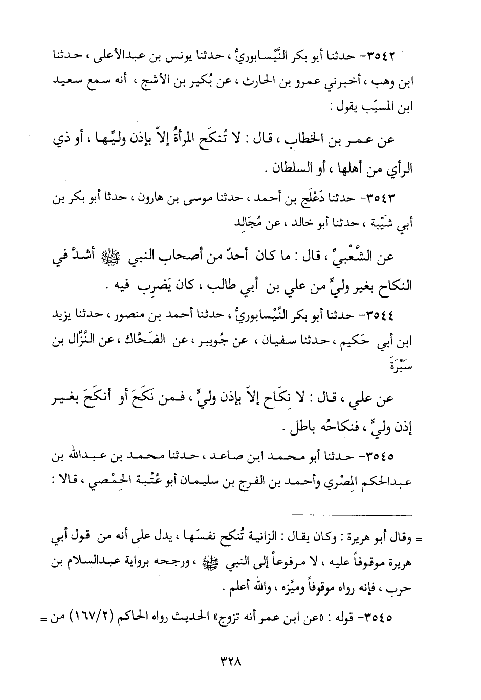 3544 - نا أَبُو بَكْرٍ النَّيْسَابُورِيُّ , نا أَحْمَدُ بْنُ مَنْصُورٍ , نا يَزِيدُ بْنُ أَبِي حَكِيمٍ , نا سُفْيَانُ , عَنْ جُوَيْبِرٍ , عَنِ الضَّحَّاكِ , عَنِ النَّزَّالِ بْنِ سَبْرَةَ , عَنْ عَلِيٍّ عَلَيْهِ السَّلَامُ , قَالَ: § «لَا نِكَاحَ إِلَّا بِإِذْنِ وَلِيٍّ فَمَنْ نَكَحَ أَوْ أَنْكَحَ بِغَيْرِ إِذْنِ وَلِيٍّ فَنِكَاحُهُ بَاطِلٌ»