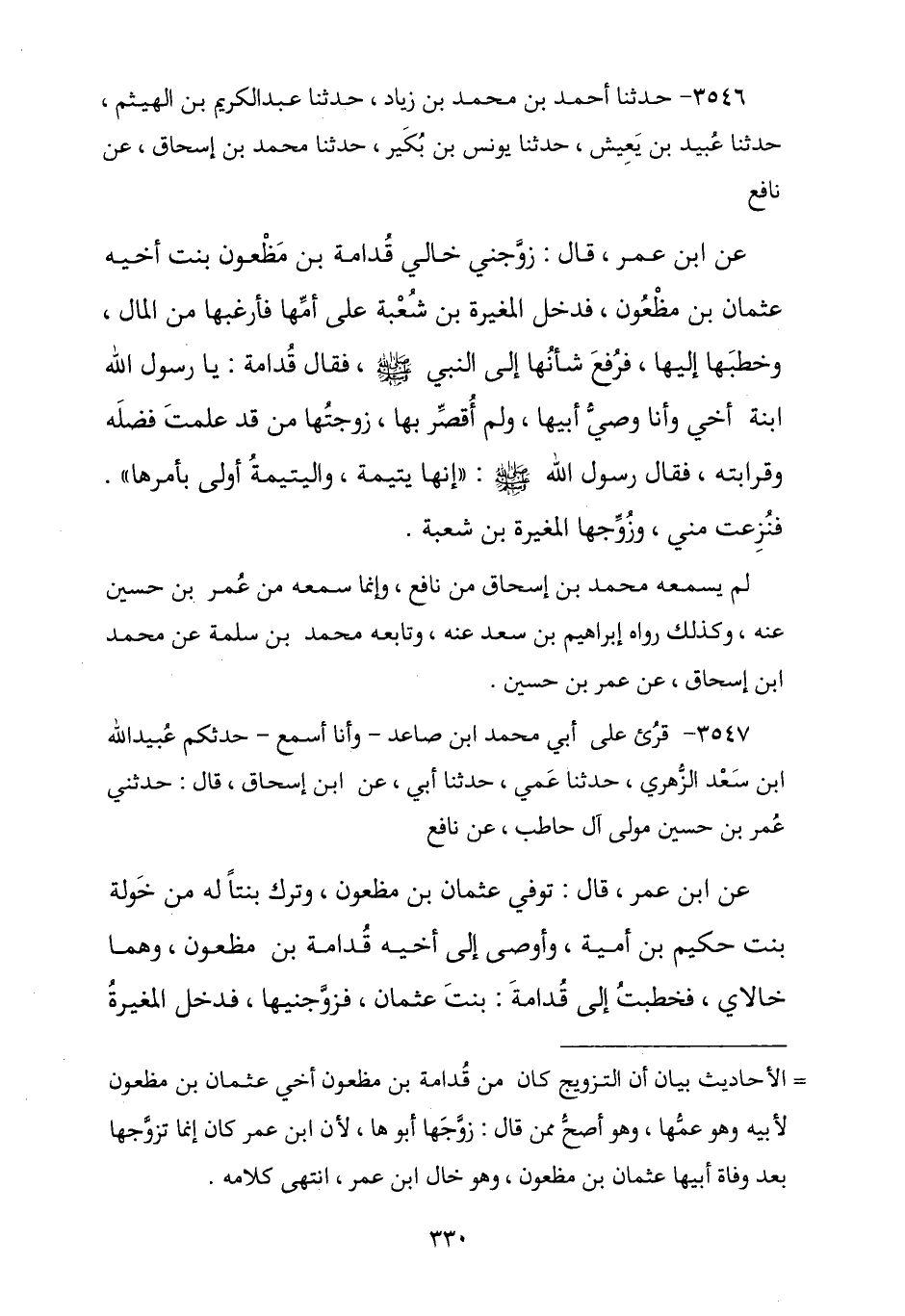3546 - نا أَحْمَدُ بْنُ مُحَمَّدِ بْنِ زِيَادٍ , نا عَبْدُ الْكَرِيمِ بْنُ الْهَيْثَمِ , نا عُبَيْدُ بْنُ يَعِيشَ , نا يُونُسُ بْنُ بُكَيْرٍ , نا مُحَمَّدُ بْنُ إِسْحَاقَ , عَنْ نَافِعٍ , عَنِ ابْنِ عُمَرَ , قَالَ: زَوَّجَنِي خَالِي قُدَامَةُ بْنُ مَظْعُونٍ بِنْتَ أَخِيهِ عُثْمَانَ بْنِ مَظْعُونٍ فَدَخَلَ الْمُغِيرَةُ بْنُ شُعْبَةَ عَلَى أُمِّهَا فَأَرْغَبَهَا فِي الْمَالِ وَخَطَبَهَا إِلَيْهَا فَرُفِعَ شَأْنُهَا إِلَى النَّبِيِّ صَلَّى اللهُ عَلَيْهِ وَسَلَّمَ , فَقَالَ قُدَامَةُ: يَا رَسُولَ اللَّهِ ابْنَةُ أَخِي وَأَنَا وَصِيُّ أَبِيهَا وَلَمْ أُقَصِّرْ بِهَا زَوَّجْتُهَا مَنْ قَدْ عَلِمْتُ فَضْلَهُ وَقَرَابَتَهُ , فَقَالَ رَسُولُ اللَّهِ صَلَّى اللهُ عَلَيْهِ وَسَلَّمَ: § «إِنَّهَا يَتِيمَةٌ وَالْيَتِيمَةُ أَوْلَى بِأَمْرِهَا». فَنُزِعَتْ مِنِّي وَزَوَّجَهَا الْمُغِيرَةِ بْنَ شُعْبَةَ. لَمْ يَسْمَعْهُ مُحَمَّدُ بْنُ إِسْحَاقَ مِنْ نَافِعٍ , وَإِنَّمَا سَمِعَهُ مِنْ عُمَرَ بْنِ حُسَيْنٍ عَنْهُ. وَكَذَلِكَ رَوَاهُ إِبْرَاهِيمُ بْنُ سَعْدٍ عَنْهُ , وَتَابَعَهُ مُحَمَّدُ بْنُ سَلَمَةَ , عَنْ مُحَمَّدِ بْنِ إِسْحَاقَ , عَنْ عُمَرَ بْنِ حُسَيْنٍ