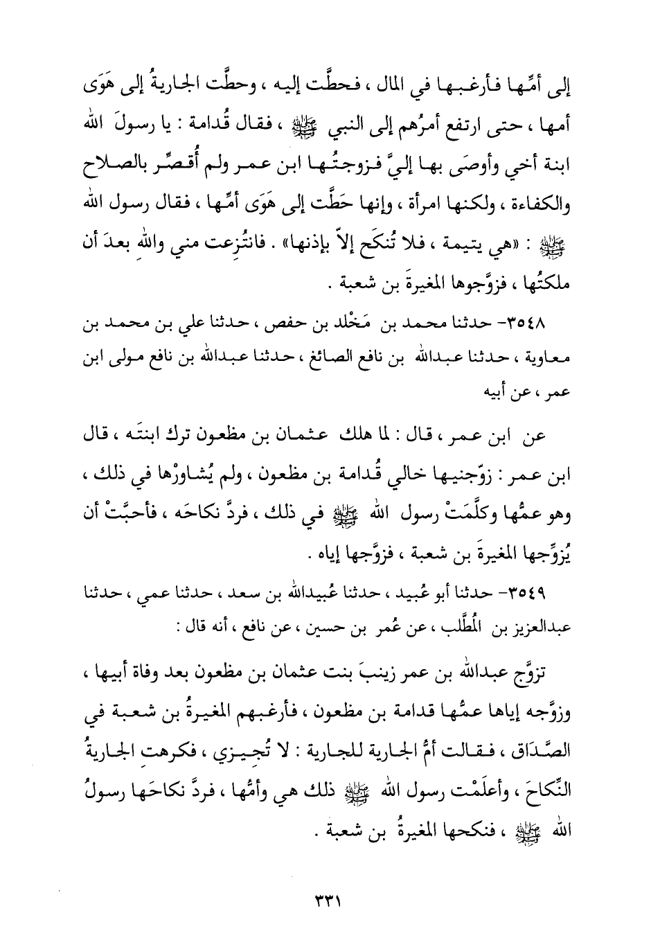 3548 - نا مُحَمَّدُ بْنُ مَخْلَدِ بْنِ حَفْصٍ , نا عَلِيُّ بْنُ مُحَمَّدِ بْنِ مُعَاوِيَةَ , نا عَبْدُ اللَّهِ بْنُ نَافِعٍ الصَّائِغُ , نا عَبْدُ اللَّهِ بْنُ نَافِعٍ مَوْلَى ابْنِ عُمَرَ , عَنْ أَبِيهِ , عَنِ ابْنِ عُمَرَ , قَالَ: لَمَّا هَلَكَ عُثْمَانُ بْنُ مَظْعُونٍ تَرَكَ ابْنَتَهُ , قَالَ ابْنُ عُمَرَ: زَوَّجَنِيهَا خَالِي قُدَامَةُ بْنُ مَظْعُونٍ وَلَمْ يُشَاوِرْهَا فِي ذَلِكَ وَهُوَ عَمُّهَا , وَكَلَّمْتَ رَسُولَ اللَّهِ صَلَّى اللهُ عَلَيْهِ وَسَلَّمَ فِي ذَلِكَ § «فَرَدَّ نِكَاحَهُ» , فَأَحَبَّتْ أَنْ يَتَزَوَّجَهَا الْمُغِيرَةُ بْنُ شُعْبَةَ , «فَزَوَّجَهَا إِيَّاهُ»