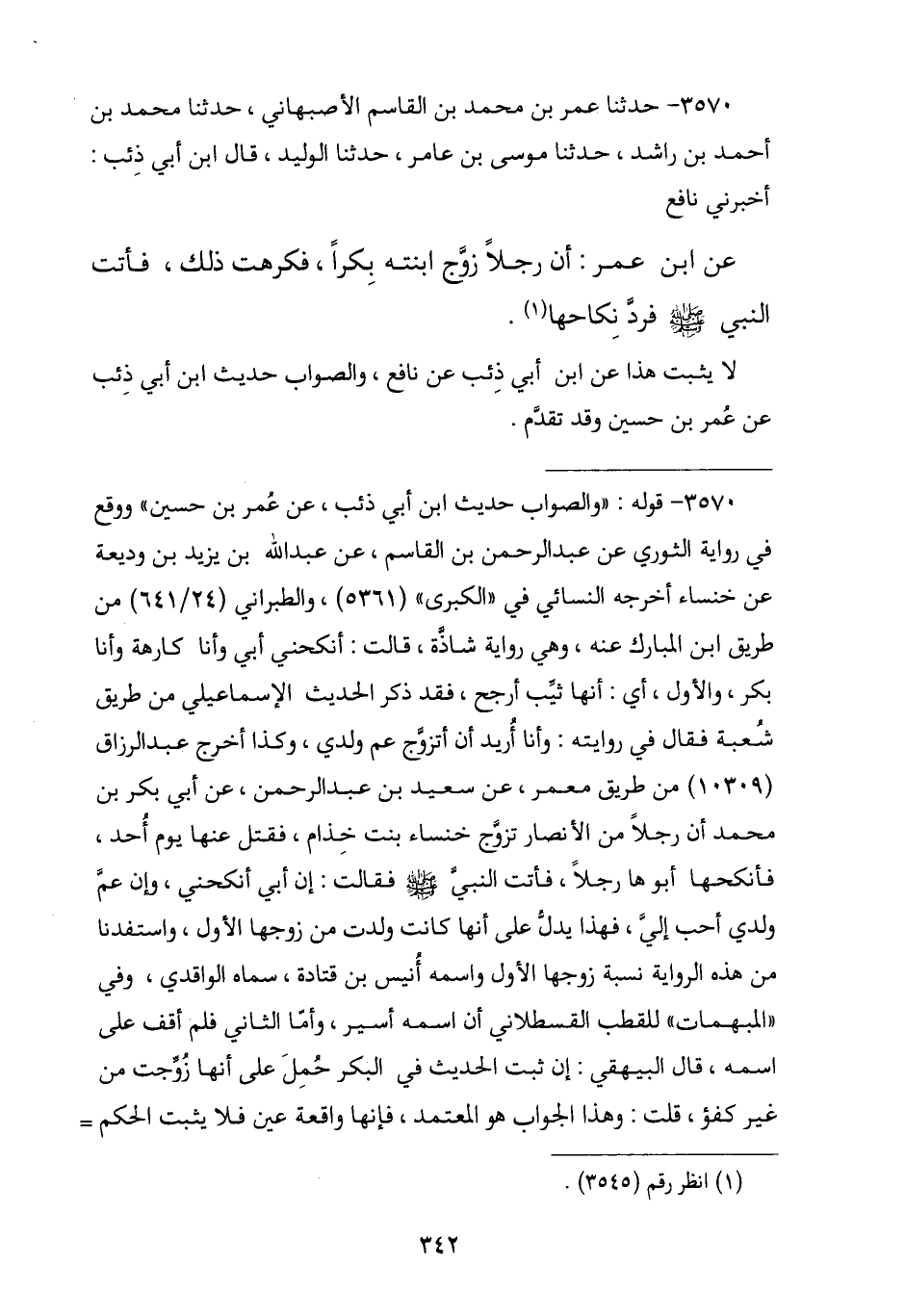 3570 - حَدَّثَنِي عُمَرُ بْنُ مُحَمَّدِ بْنِ الْقَاسِمِ الْأَصْبَهَانِيُّ , نا مُحَمَّدُ بْنُ أَحْمَدَ بْنِ رَاشِدٍ , نا مُوسَى بْنُ عَامِرٍ , نا الْوَلِيدُ , قَالَ: قَالَ ابْنُ أَبِي ذِئْبٍ: أَخْبَرَنِي نَافِعٌ , عَنِ ابْنِ عُمَرَ , أَنَّ رَجُلًا §زَوَّجَ ابْنَتَهُ بِكْرًا فَكَرِهَتْ ذَلِكَ , فَأَتَتِ النَّبِيَّ صَلَّى اللهُ عَلَيْهِ وَسَلَّمَ «فَرَدَّ نكاحها». لَا يُثْبَتُ هَذَا عَنِ ابْنِ أَبِي ذِئْبٍ , عَنْ نَافِعٍ , وَالصَّوَابُ حَدِيثُ ابْنِ أَبِي ذِئْبٍ , عَنْ عُمَرَ بْنِ حُسَيْنٍ وَقَدْ تَقَدَّمَ