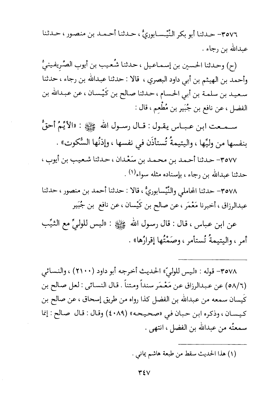 3576 - نا أَبُو بَكْرٍ النَّيْسَابُورِيُّ , نا أَحْمَدُ بْنُ مَنْصُورٍ , نا عَبْدُ اللَّهِ بْنُ رَجَاءٍ , ح وَنا الْحُسَيْنُ بْنُ إِسْمَاعِيلَ , نا شُعَيْبُ بْنُ أَيُّوبَ الصَّرِيفِينِيُّ , وَأَحْمَدُ بْنُ الْهَيْثَمِ بْنِ أَبِي دَاوُدَ الْبَصْرِيُّ , ح وَنا أَحْمَدُ بْنُ مُحَمَّدِ بْنِ سَعْدَانَ , نا شُعَيْبُ بْنُ أَيُّوبَ , قَالَا: نا عَبْدُ اللَّهِ بْنُ رَجَاءٍ , نا سَعِيدُ بْنُ سَلَمَةَ بْنِ أَبِي الْحُسَامِ , نا صَالِحُ بْنُ كَيْسَانَ , عَنْ عَبْدِ اللَّهِ بْنِ الْفَضْلِ , عَنْ نَافِعِ بْنِ جُبَيْرِ بْنِ مُطْعِمٍ , قَالَ: سَمِعْتُ ابْنَ عَبَّاسٍ , يَقُولُ: قَالَ رَسُولُ اللَّهِ صَلَّى اللهُ عَلَيْهِ وَسَلَّمَ: § «الْأَيِّمُ أَحَقُّ بِنَفْسِهَا مِنْ وَلِيِّهَا , وَالْيَتِيمَةُ تُسْتَأْذَنُ فِي نَفْسِهَا وَإِذْنُهَا السُّكُوتُ»