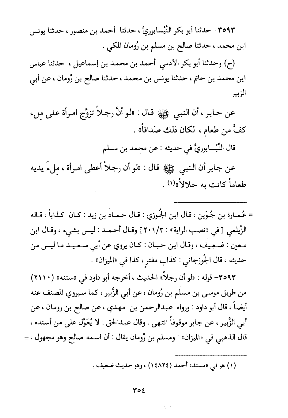 3593 - نا أَبُو بَكْرٍ النَّيْسَابُورِيُّ , نا أَحْمَدُ بْنُ مَنْصُورٍ , نا يُونُسُ بْنُ مُحَمَّدٍ , نا صَالِحُ بْنُ مُسْلِمِ بْنِ رُومَانَ الْمَكِّيُّ , ح وَنا أَبُو بَكْرِأَحْمَدَ بْنِ مُحَمَّدِ بْنِ إِسْمَاعِيلَ الْآدَمَيُّ , نا عَبَّاسُ بْنُ مُحَمَّدِ بْنِ حَاتِمٍ , نا يُونُسُ بْنُ مُحَمَّدٍ , نا صَالِحُ بْنُ رُومَانَ , عَنْ أَبِي الزُّبَيْرِ , عَنْ جَابِرٍ , أَنَّ النَّبِيَّ صَلَّى اللهُ عَلَيْهِ وَسَلَّمَ , قَالَ: «لَوْ أَنَّ رَجُلًا §تَزَوَّجَ امْرَأَةً عَلَى مِلْءِ كَفٍّ مِنْ طَعَامٍ لَكَانَ ذَلِكَ صَدَاقَهَا». قَالَ النَّيْسَابُورِيُّ ِي حَدِيثِهِ , عَنْ مُحَمَّدِ بْنِ مُسْلِمٍ , عَنْ جَابِرٍ: إِنَّ النَّبِيَّ صَلَّى اللهُ عَلَيْهِ وَسَلَّمَ , قَالَ: «لَوْ أَنَّ رَجُلًا أَعْطَى امْرَأَةً مِلْءَ يَدَيْهِ طَعَامًا كَانَتْ بِهِ حَلَالًا»