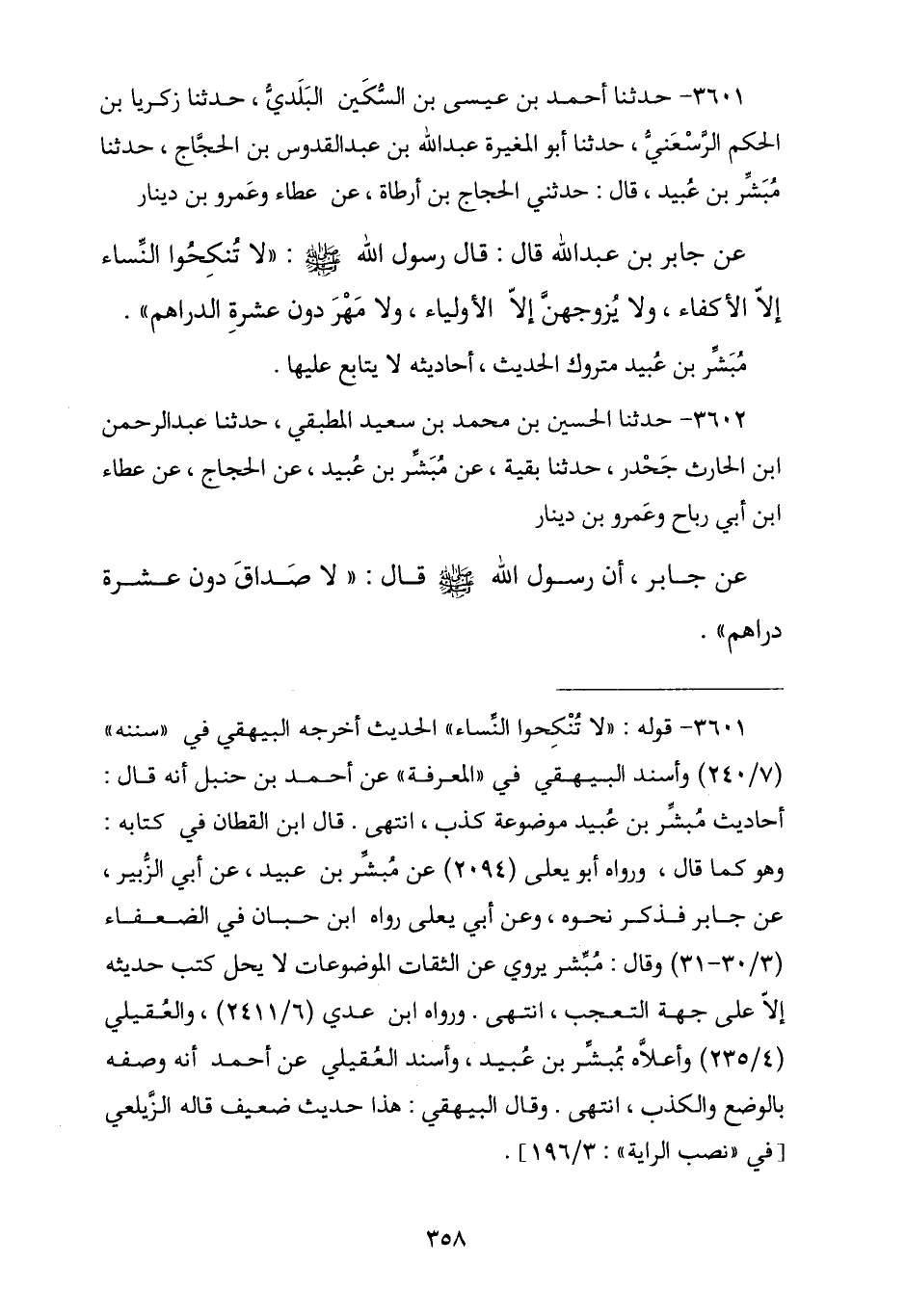 3601 - نا أَحْمَدُ بْنُ عِيسَى بْنِ السُّكَيْنِ الْبَلَدِيُّ , نا زَكَرِيَّا بْنُ الْحَكَمِ الذَّسْعَنِيُّ , نا أَبُو الْمُغِيرَةِ عَبْدُ الْقُدُّوسِ بْنُ الْحَجَّاجِ , نا مُبَشِّرُ بْنُ عُبَيْدٍ , حَدَّثَنِي الْحَجَّاجُ بْنُ أَرْطَاةَ , عَنْ عَطَاءٍ , وَعَمْرِو بْنِ دِينَارٍ , عَنْ جَابِرِ بْنِ عَبْدِ اللَّهِ , قَالَ: قَالَ رَسُولُ اللَّهِ صَلَّى اللهُ عَلَيْهِ وَسَلَّمَ: § «لَا تَنْكِحُوا النِّسَاءَ إِلَّا الْأَكْفَاءَ , وَلَا يُزَوِّجُهُنَّ إِلَّا الْأَوْلِيَاءُ , وَلَا مَهْرَ دُونَ عَشَرَةِ دَرَاهِمَ». مُبَشِّرُ بْنُ عُبَيْدٍ مَتْرُوكُ الْحَدِيثِ أَحَادِيثُهُ لَا يُتَابَعُ عَلَيْهَا