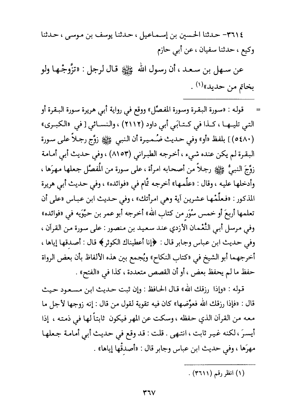 3614 - نا الْحُسَيْنُ بْنُ إِسْمَاعِيلَ , نا يُوسُفُ بْنُ مُوسَى , نا وَكِيعٌ , نا سُفْيَانُ , عَنْ أَبِي حَازِمٍ , عَنْ سَهْلِ بْنِ سَعْدٍ , أَنَّ رَسُولَ اللَّهِ صَلَّى اللهُ عَلَيْهِ وَسَلَّمَ قَالَ لِرَجُلٍ: § «تَزَوَّجْهَا وَلَوْ بِخَاتَمٍ مِنْ حَدِيدٍ»