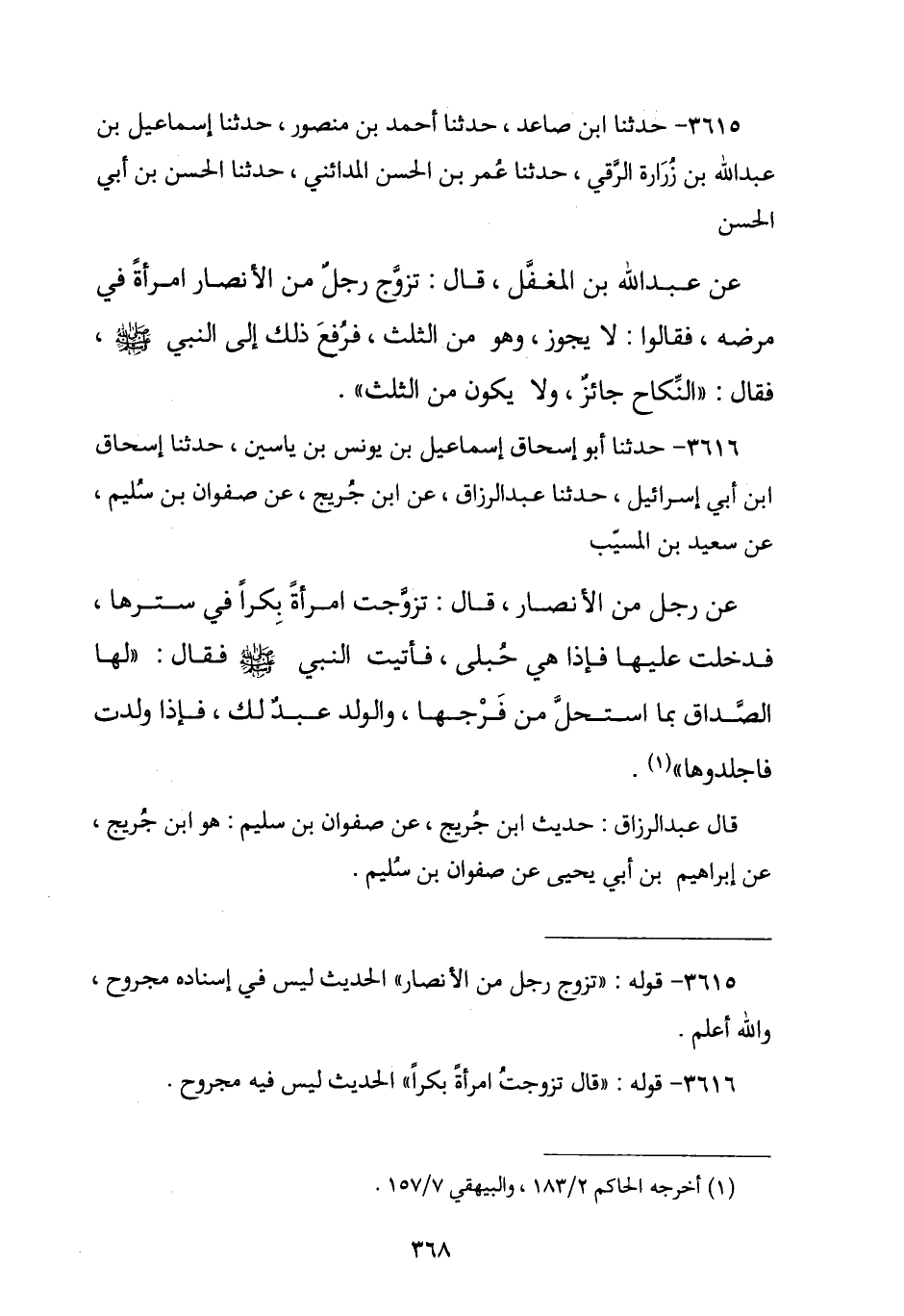 3616 - حَدَّثَنَا أَبُو إِسْحَاقَ إِسْمَاعِيلُ بْنُ يُونُسَ بْنِ يَاسِينَ , نا إِسْحَاقُ بْنُ أَبِي إِسْرَائِيلَ , نا عَبْدُ الرَّزَّاقِ , عَنِ ابْنِ جُرَيْجٍ , عَنْ صَفْوَانَ بْنِ سُلَيْمٍ , عَنْ سَعِيدِ بْنِ الْمُسَيِّبِ , عَنْ رَجُلٍ مِنَ الْأَنْصَارِ , قَالَ: تَزَوَّجْتُ امْرَأَةً بِكْرًا فِي سِتْرِهَا فَدَخَلْتُ عَلَيْهَا فَإِذَا هِيَ حُبْلَى , فَأَتَيْتُ النَّبِيَّ صَلَّى اللهُ عَلَيْهِ وَسَلَّمَ , فَقَالَ: § «لَهَا الصَّدَاقُ بِمَا اسْتَحَلَّ مِنْ فَرْجِهَا , وَالْوَلَدُ عَبْدٌ لَكَ فَإِذَا وَلَدَتْ فَاجْلِدُوهَا». قَالَ عَبْدُ الرَّزَّاقِ: حَدِيثُ ابْنِ جُرَيْجٍ عَنْ صَفْوَانَ , هُوَ ابْنُ جُرَيْجٍ , عَنْ إِبْرَاهِيمَ بْنِ أَبِي يَحْيَى , عَنْ صَفْوَانَ بْنِ سُلَيْمٍ