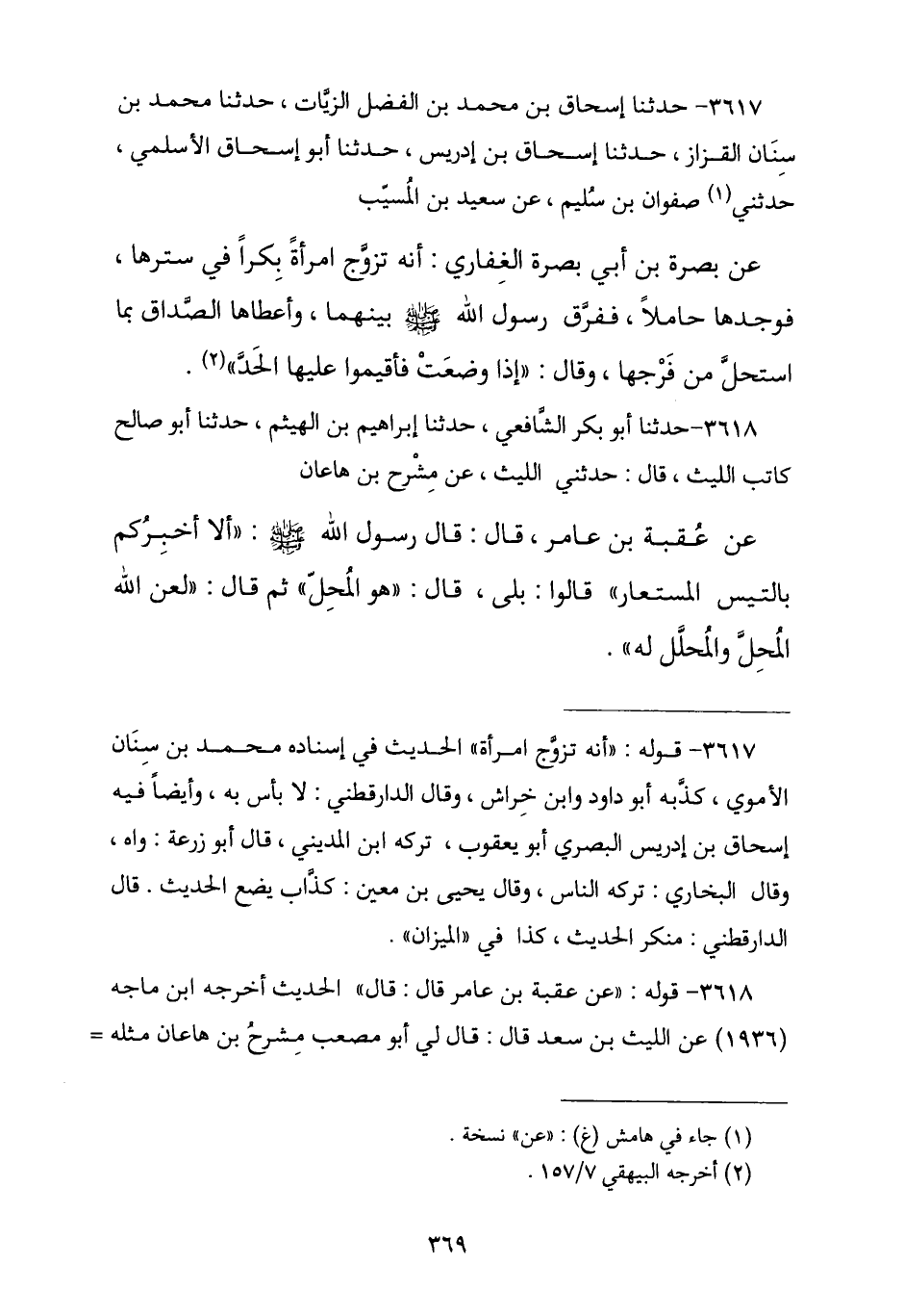 3618 - حَدَّثَنَا أَبُو بَكْرٍ الشَّافِعِيُّ , نا إِبْرَاهِيمُ بْنُ الْهَيْثَمِ , نا أَبُو صَالِحٍ كَاتِبُ اللَّيْثِ , حَدَّثَنِي اللَّيْثُ , عَنْ مِشْرَحِ بْنِ هَاعَانَ , عَنْ عُقْبَةَ بْنِ عَامِرٍ , قَالَ: قَالَ رَسُولُ اللَّهِ صَلَّى اللهُ عَلَيْهِ وَسَلَّمَ: «أَلَا أُخْبِرُكُمْ بِالتَّيْسِ الْمُسْتَعَارِ؟» , قَالُوا: بَلَى قَالَ: «هُوَ الْمُحِلُّ» , ثُمَّ قَالَ: § «لَعَنَ اللَّهُ الْمُحِلَّ وَالْمُحَلَّلَ لَهُ»