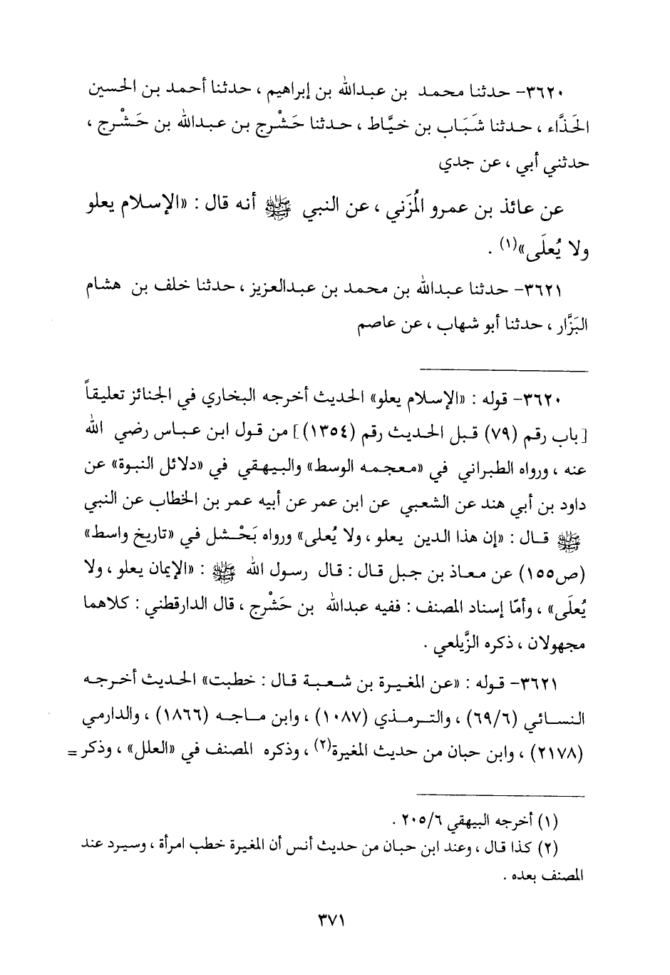 3620 - حَدَّثَنَا مُحَمَّدُ بْنُ عَبْدِ اللَّهِ بْنِ إِبْرَاهِيمَ , نا أَحْمَدُ بْنُ الْحُسَيْنِ الْحَذَّاءُ , نا شَبَابُ بْنُ خَيَّاطٍ , نا حَشْرَجُ بْنُ عَبْدِ اللَّهِ بْنِ حَشْرَجٍ , حَدَّثَنِي أَبِي , عَنْ جَدِّي , عَنْ عَائِذِ بْنِ عَمْرٍو الْمُزَنِيِّ , عَنِ النَّبِيِّ صَلَّى اللهُ عَلَيْهِ وَسَلَّمَ , قَالَ: § «الْإِسْلَامُ يَعْلُو وَلَا يُعْلَى»