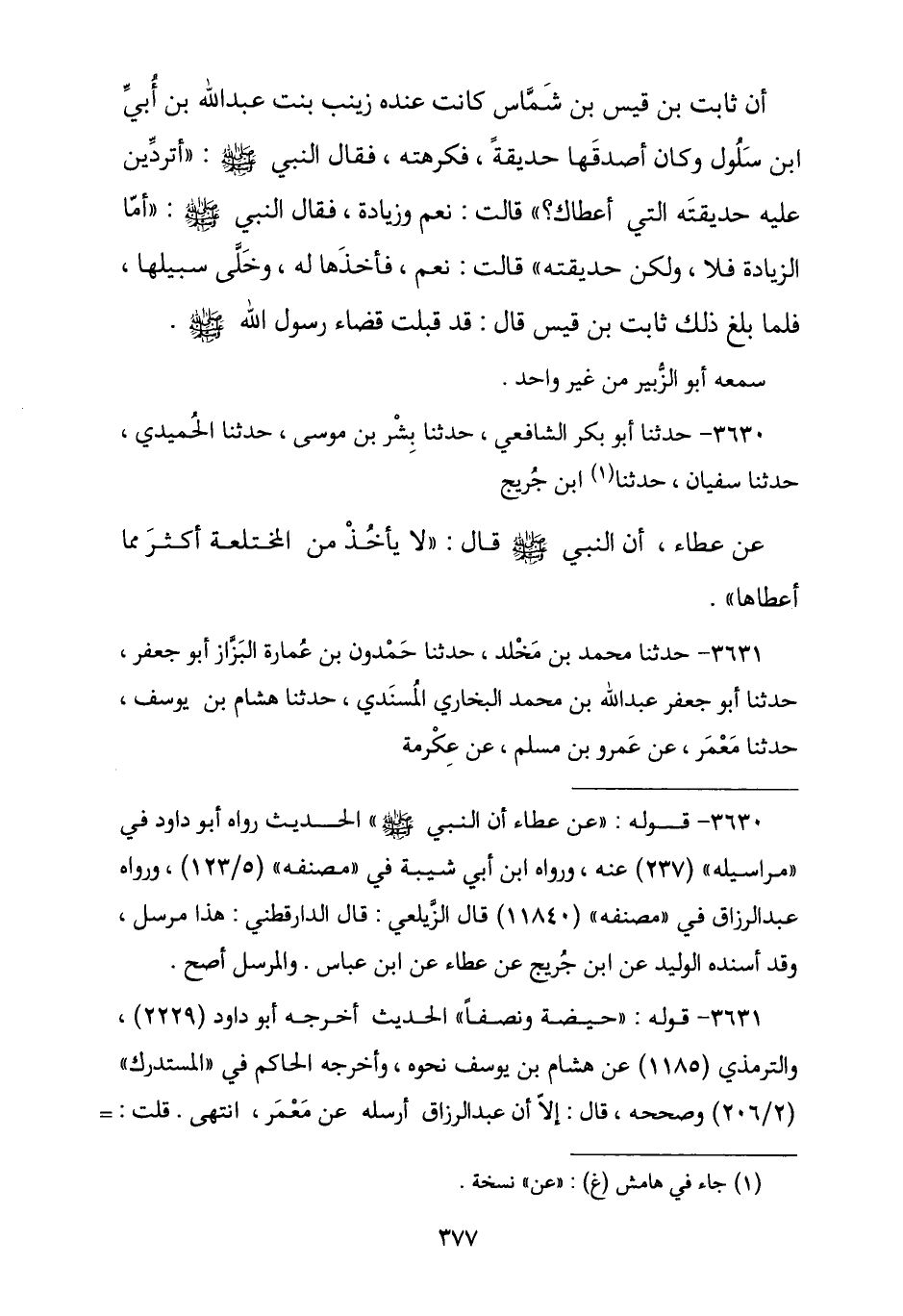3631 - نا مُحَمَّدُ بْنُ مَخْلَدٍ , نا حَمْدُونُ بْنُ عُمَارَةَ الْبَزَّازُ أَبُو جَعْفَرٍ , نا أَبُو جَعْفَرٍ عَبْدُ اللَّهِ بْنُ مُحَمَّدٍ الْبُخَارِيُّ الْمُسْنَدِيُّ , نا هِشَامُ بْنُ يُوسُفَ , نا مَعْمَرٌ , عَنْ عَمْرِو بْنِ مُسْلِمٍ , عَنْ عِكْرِمَةَ , -[378]- عَنِ ابْنِ عَبَّاسٍ , أَنَّ امْرَأَةَ ثَابِتِ بْنِ قَيْسٍ اخْتَلَعَتْ مِنْ زَوْجِهَا , «فَجَعَلَ النَّبِيُّ صَلَّى اللهُ عَلَيْهِ وَسَلَّمَ §عِدَّتَهَا حَيْضَةً وَنِصْفًا»