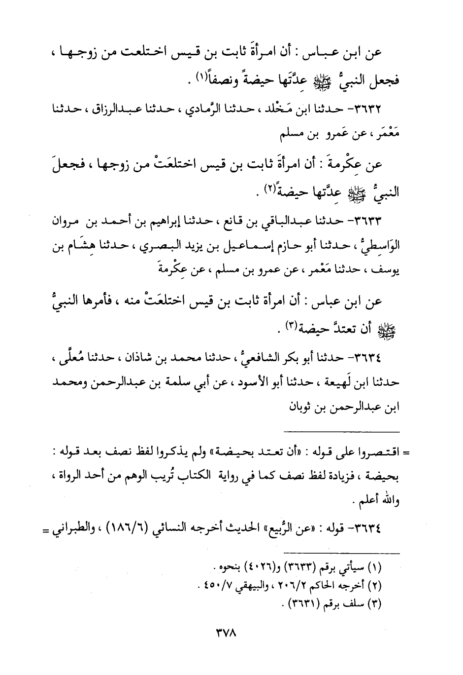 3634 - نا أَبُو بَكْرٍ الشَّافِعِيُّ , نا مُحَمَّدُ بْنُ شَاذَانَ , نا مُعَلَّى , نا ابْنُ لَهِيعَةَ , نا أَبُو الْأَسْوَدِ , عَنْ أَبِي سَلَمَةَ بْنِ عَبْدِ الرَّحْمَنِ , وَمُحَمَّدِ بْنِ عَبْدِ الرَّحْمَنِ بْنِ ثَوْبَانَ , -[379]- عَنِ الرُّبَيِّعِ بِنْتِ مُعَوِّذٍ , قَالَتْ: سَمِعْتُ رَسُولَ اللَّهِ صَلَّى اللهُ عَلَيْهِ وَسَلَّمَ أَمَرَ امْرَأَةَ ثَابِتِ بْنِ قَيْسٍ حِينَ اخْتَلَعَتْ مِنْهُ § «أَنْ تَعْتَدَّ حَيْضَةً»
