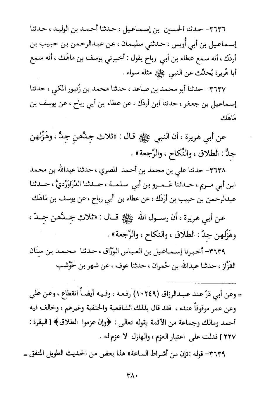 3638 - نا عَلِيُّ بْنُ مُحَمَّدِ بْنِ أَحْمَدَ الْمِصْرِيُّ , نا عَبْدُ اللَّهِ بْنُ أَحْمَدَ بْنِ مُحَمَّدِ بْنِ أَبِي مَرْيَمَ , نا عَمْرُو بْنُ أَبِي سَلَمَةَ , نا الدَّرَاوَرْدِيُّ , نا عَبْدُ الرَّحْمَنِ بْنُ حَبِيبِ بْنِ أَرْدَكَ , عَنْ عَطَاءِ بْنِ أَبِي رَبَاحٍ , عَنْ يُوسُفَ بْنِ مَاهَكَ , عَنْ أَبِي هُرَيْرَةَ , أَنَّ رَسُولَ اللَّهِ صَلَّى اللهُ عَلَيْهِ وَسَلَّمَ قَالَ: " §ثَلَاثٌ جِدُّهُنَّ جِدٌّ وَهَزْلُهُنَّ جِدٌّ: الطَّلَاقُ وَالنِّكَاحُ وَالرَّجْعَةُ "