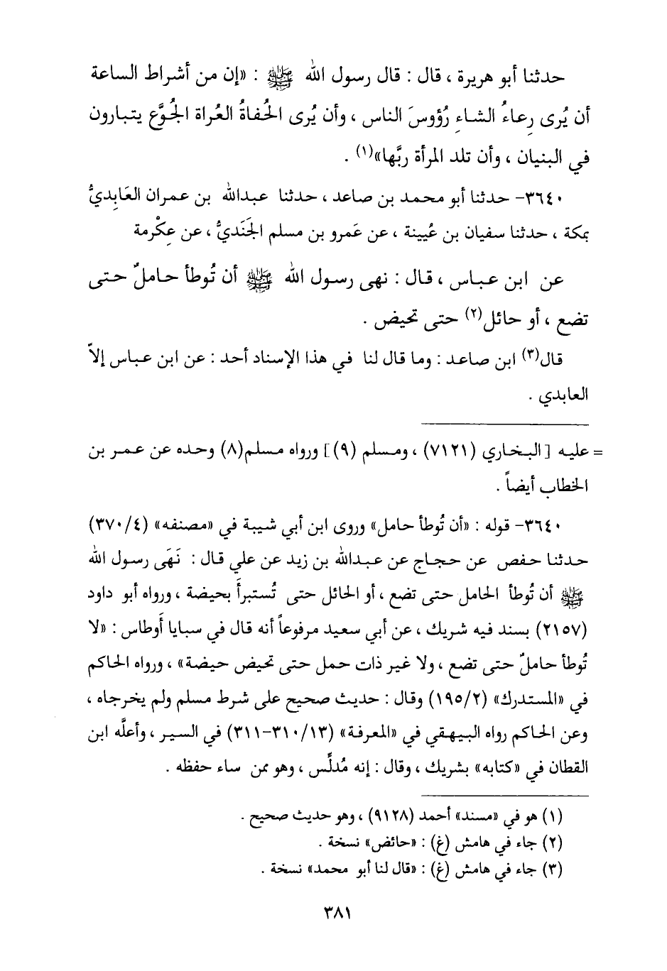 3640 - نا أَبُو مُحَمَّدِ بْنُ صَاعِدٍ , نا عَبْدُ اللَّهِ بْنُ عِمْرَانَ الْعَائِذِيُّ بِمَكَّةَ , نا سُفْيَانُ بْنُ عُيَيْنَةَ , عَنْ عَمْرِو بْنِ مُسْلِمٍ الْجَنَدِيِّ , عَنْ عِكْرِمَةَ , عَنِ ابْنِ عَبَّاسٍ , قَالَ: «نَهَى رَسُولُ اللَّهِ صَلَّى اللهُ عَلَيْهِ وَسَلَّمَ أَنْ §تُوطَأَ حَامِلٌ حَتَّى تَضَعَ , أَوْ حَائِلٌ حَتَّى تَحِيضَ». قَالَ لَنَا ابْنُ صَاعِدٍ: وَمَا قَالَ لَنَا فِي هَذَا الْإِسْنَادِ أَحَدٌ عَنِ ابْنِ عَبَّاسِ إِلَّا الْعَائِذِيُّ