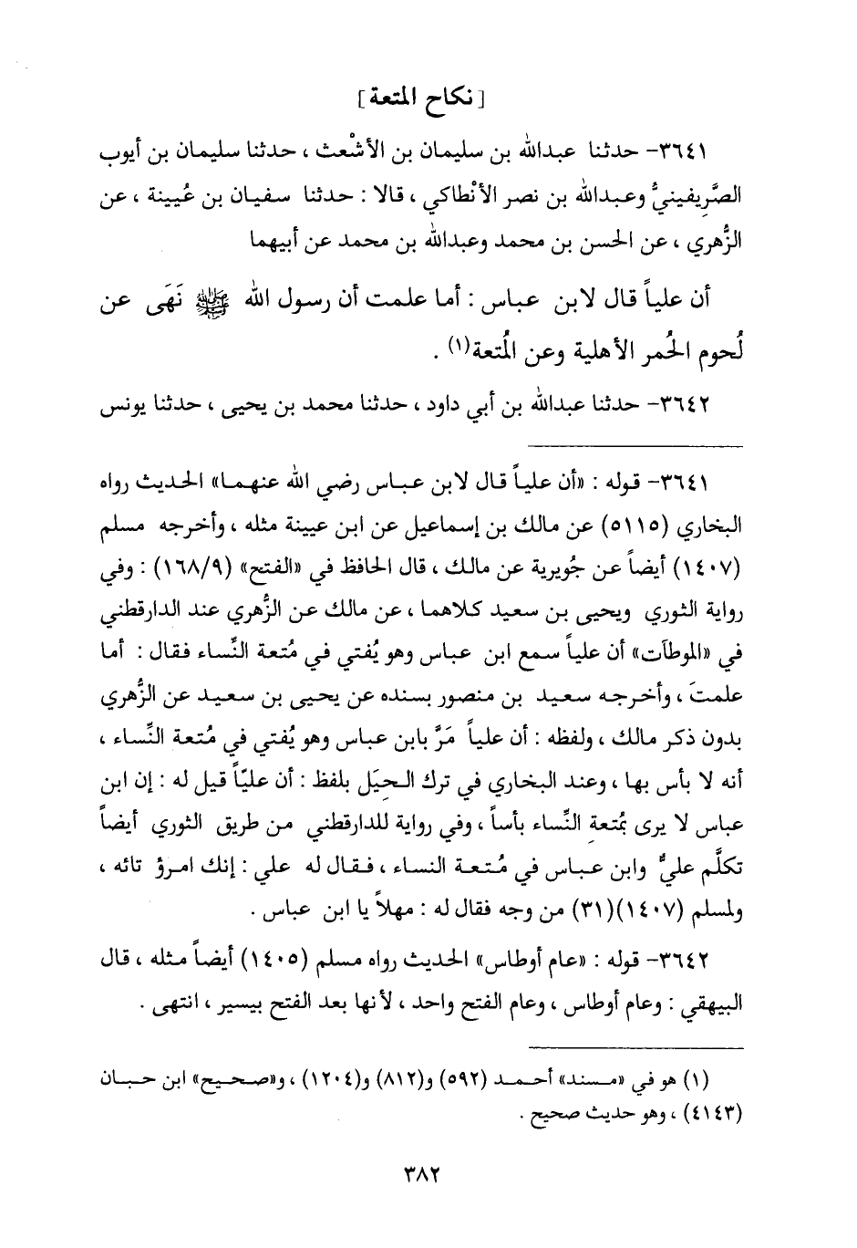 3641 - نا عَبْدُ اللَّهِ بْنُ سُلَيْمَانَ بْنِ الْأَشْعَثِ , نا سُلَيْمَانُ بْنُ أَيُّوبَ الصَّرِيفِينِيُّ , وَعَبْدُ اللَّهِ بْنُ نَصْرٍ الْأَنْطَاكِيُّ , قَالَا: نا سُفْيَانُ بْنُ عُيَيْنَةَ , عَنِ الزُّهْرِيِّ , عَنِ الْحَسَنِ بْنِ مُحَمَّدٍ , وَعَبْدِ اللَّهِ بْنِ مُحَمَّدٍ , عَنْ أَبِيهِمَا , أَنَّ عَلِيًّا رَضِيَ اللَّهُ عَنْهُ قَالَ لِابْنِ عَبَّاسٍ: أَمَا عَلِمْتَ أَنَّ رَسُولَ اللَّهِ صَلَّى اللهُ عَلَيْهِ وَسَلَّمَ § «نَهَى عَنْ لُحُومِ الْحُمُرِ الْأَهْلِيَّةِ وَعَنِ الْمُتْعَةِ»
