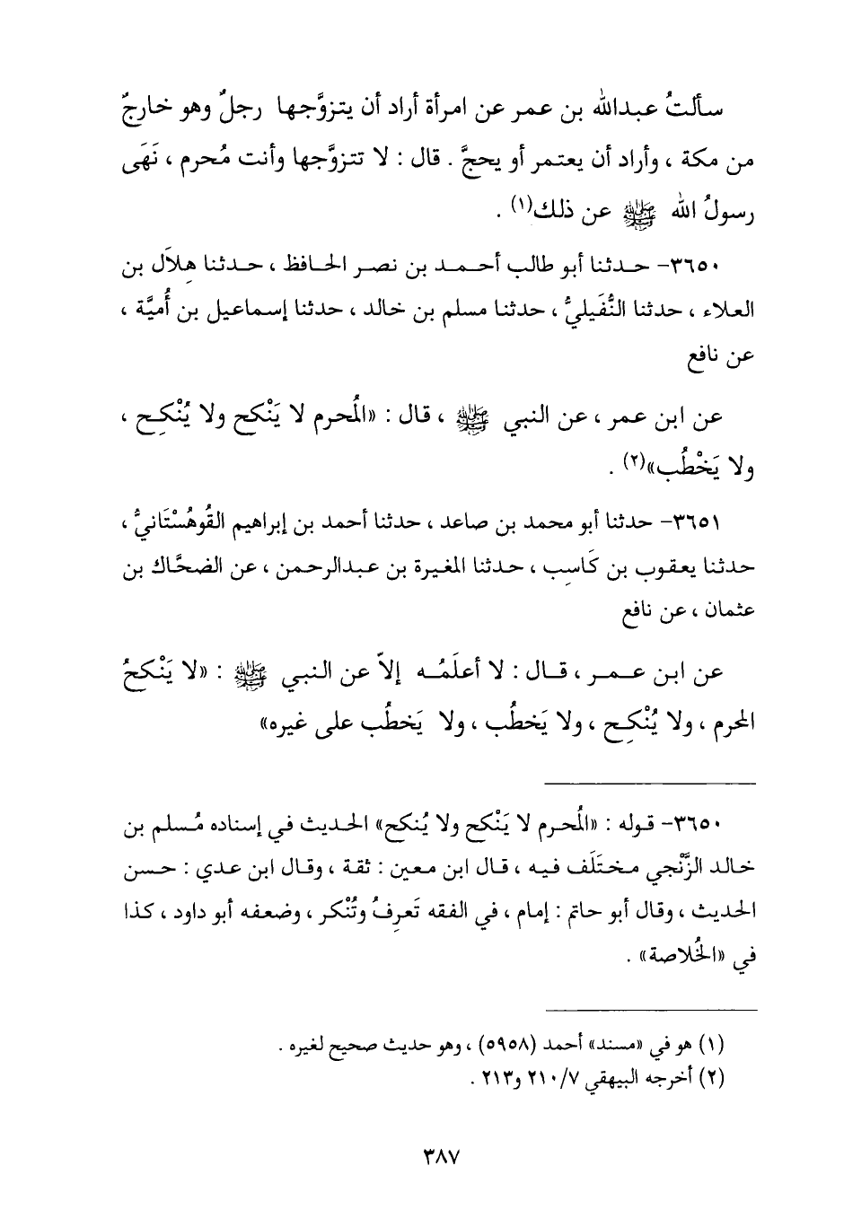 3650 - نا أَبُو طَالِبٍ أَحْمَدُ بْنُ نَصْرٍ الْحَافِظُ , نا هِلَالُ بْنُ الْعَلَاءِ , نا النُّفَيْلِيُّ , نا مُسْلِمُ بْنُ خَالِدٍ , نا إِسْمَاعِيلُ بْنُ أُمَيَّةَ , عَنْ نَافِعٍ , عَنِ ابْنِ عُمَرَ , عَنِ النَّبِيِّ صَلَّى اللهُ عَلَيْهِ وَسَلَّمَ , قَالَ: § «الْمُحْرِمُ لَا يَنْكِحُ وَلَا يُنْكِحُ وَلَا يَخْطُبُ»
