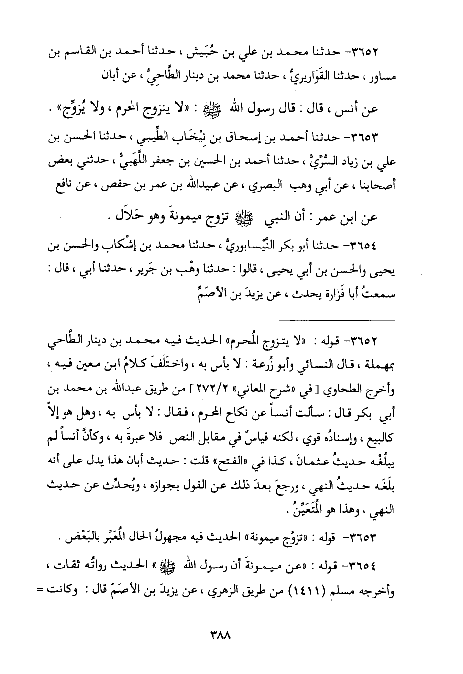 3652 - نا مُحَمَّدُ بْنُ عَلِيِّ بْنِ حُبَيْشٍ , نا أَحْمَدُ بْنُ الْقَاسِمِ بْنِ مُسَاوِرٍ , نا الْقَوَارِيرِيُّ , نا مُحَمَّدُ بْنُ دِينَارٍ الطَّاحِيُّ , عَنْ أَبَانَ , عَنْ أَنَسٍ , قَالَ: قَالَ رَسُولُ اللَّهِ صَلَّى اللهُ عَلَيْهِ وَسَلَّمَ: § «لَا يَتَزَوَّجُ الْمُحْرِمُ وَلَا يُزَوِّجُ»