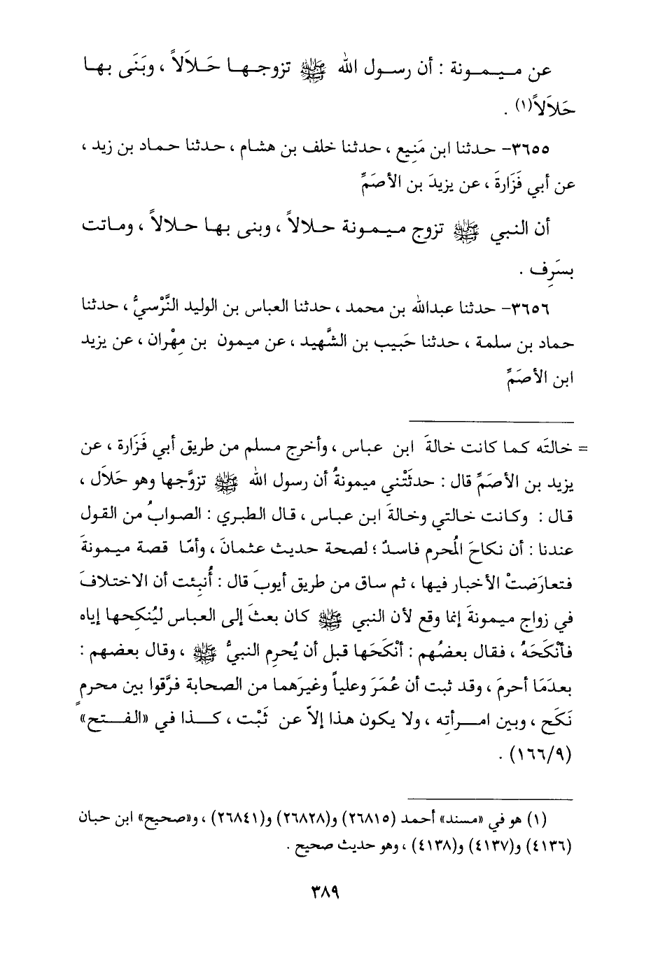3655 - نا ابْنُ مَنِيعٍ , نا خَلَفُ بْنُ هِشَامٍ , نا حَمَّادٌ , عَنْ أَبِي فَزَارَةَ , عَنْ يَزِيدَ بْنِ الْأَصَمِّ , أَنَّ رَسُولَ اللَّهِ صَلَّى اللهُ عَلَيْهِ وَسَلَّمَ § «تَزَوَّجَ مَيْمُونَةَ حَلَالًا وَبَنَى بِهَا حَلَالًا وَمَاتَتْ بِسَرِفَ»