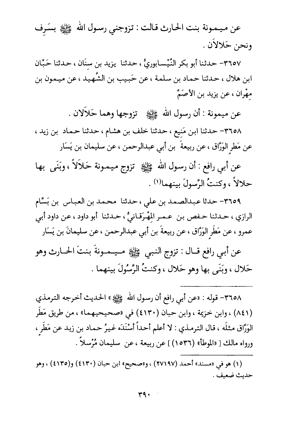 3657 - نا أَبُو بَكْرٍ النَّيْسَابُورِيُّ , نا يَزِيدُ بْنُ سِنَانٍ , نا حَبَّانُ بْنُ هِلَالٍ , نا حَمَّادُ بْنُ سَلَمَةَ , عَنْ حَبِيبِ بْنِ الشَّهِيدِ , عَنْ مَيْمُونِ بْنِ مِهْرَانَ , عَنْ يَزِيدَ بْنِ الْأَصَمِّ , عَنْ مَيْمُونَةَ , أَنَّ رَسُولَ اللَّهِ صَلَّى اللهُ عَلَيْهِ وَسَلَّمَ § «تَزَوَّجَهَا وَهُمَا حَلَالَانِ»